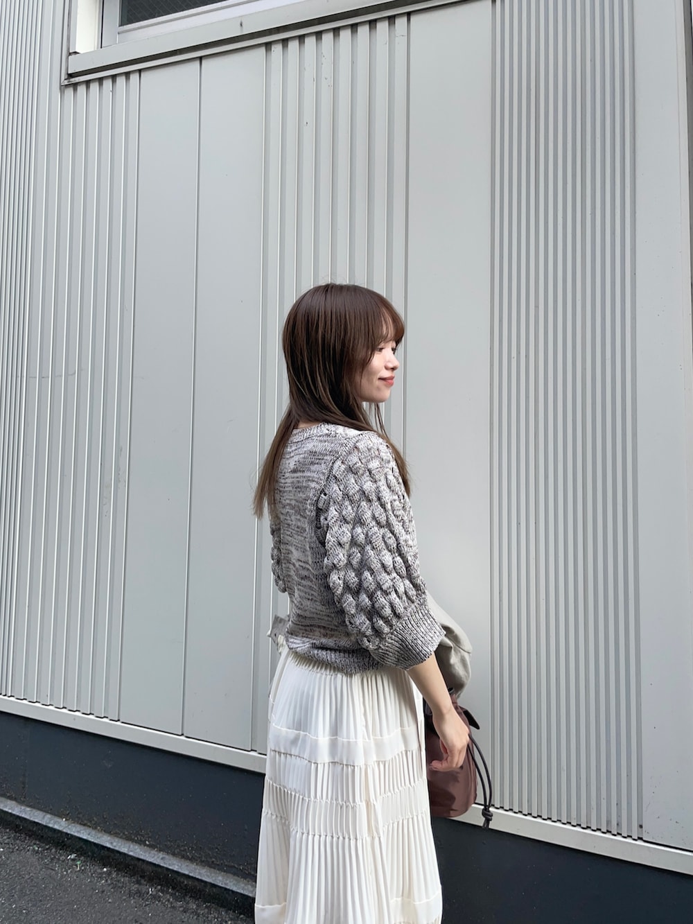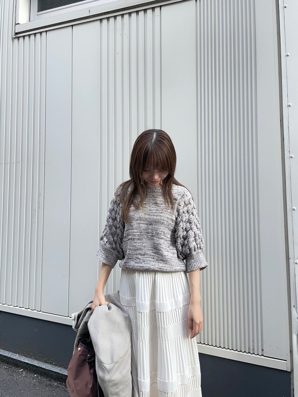 中のトップスはLAATOのランタンスリーブニットです!袖のデザインがポコポコデザインになっており、可愛いです✨夏も使えるサマーニット素材で、丈感も短めなのでスカートやパンツにも合わせていただきやすいです!