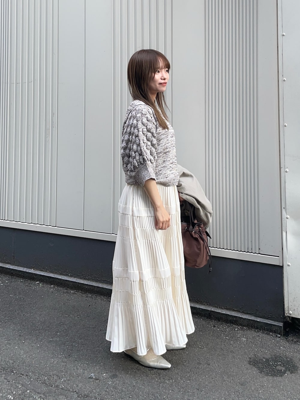 スカートはプリーツティアードスカートです!段々に切り返しがついており、一見シンプルなデザインですが、ワンポイントデザインとなっており、あまり広がりすぎないシルエットが好きです✨低身長でも着れてウエストゴムなのも嬉しいポイントです✨