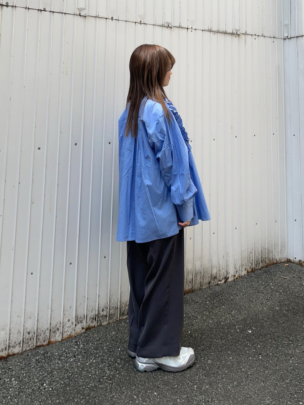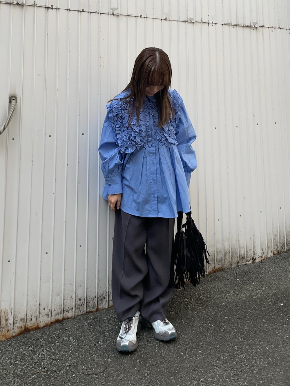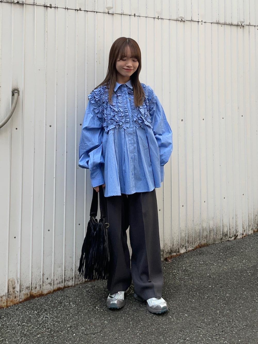 トップスのブラウスはフロントがフリルになったデザインで、まるでビスチェを着てるようなシルエットで、一眼引くデザインです✨ギャザーによって裾がAラインに広がる形なので、ワイドなパンツやスカートにも合わせていただきやすいです!