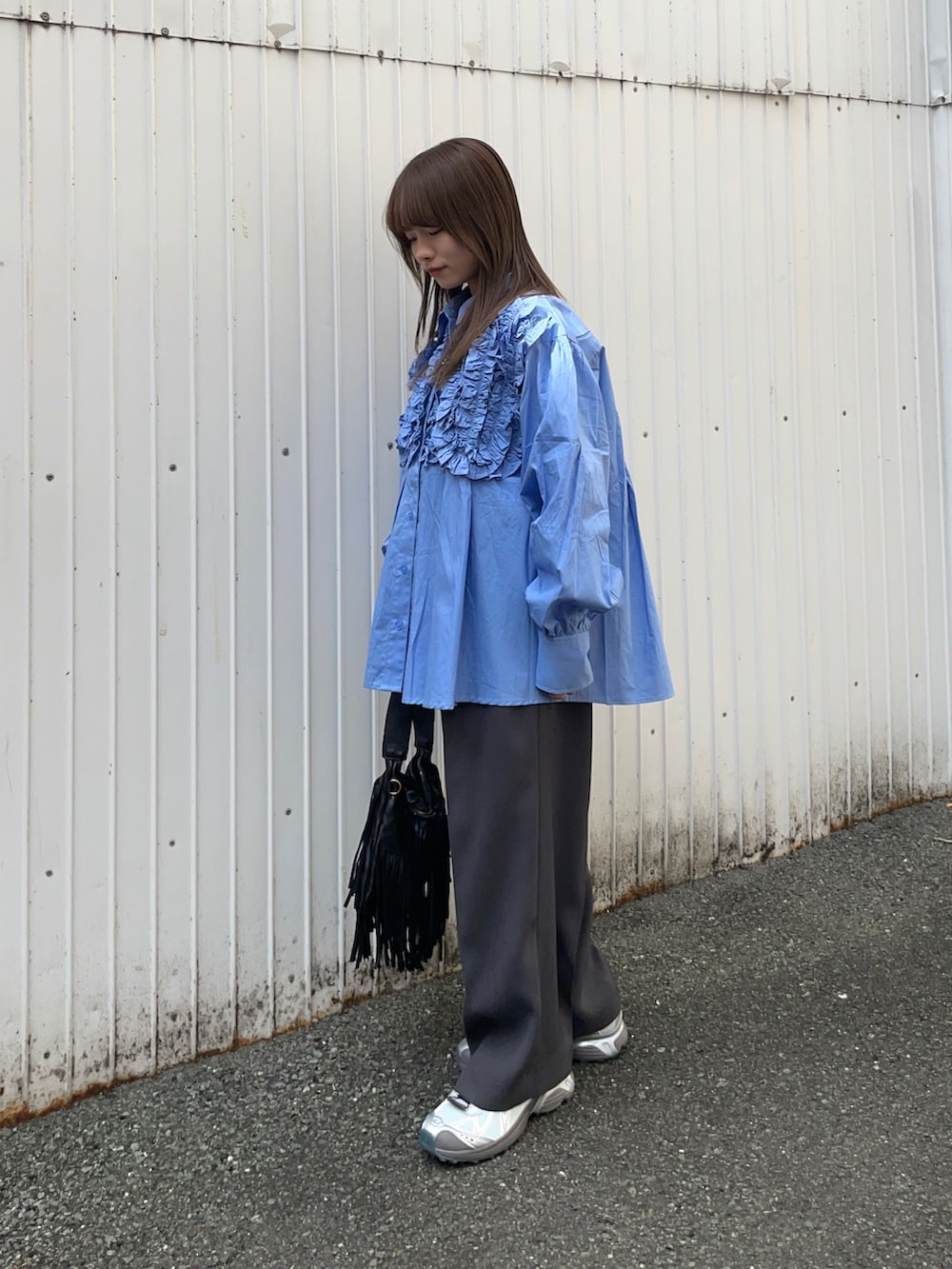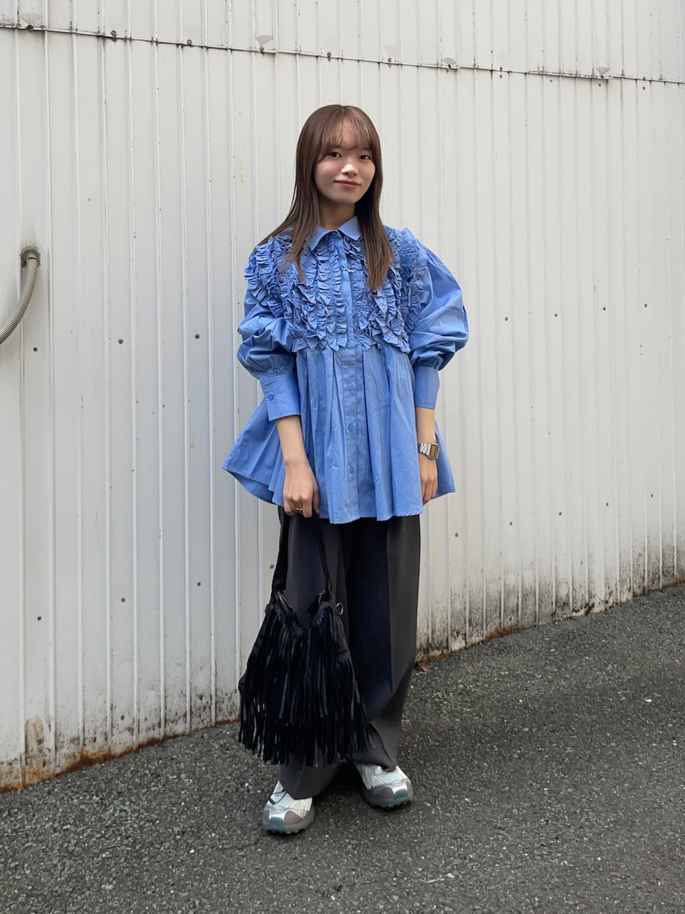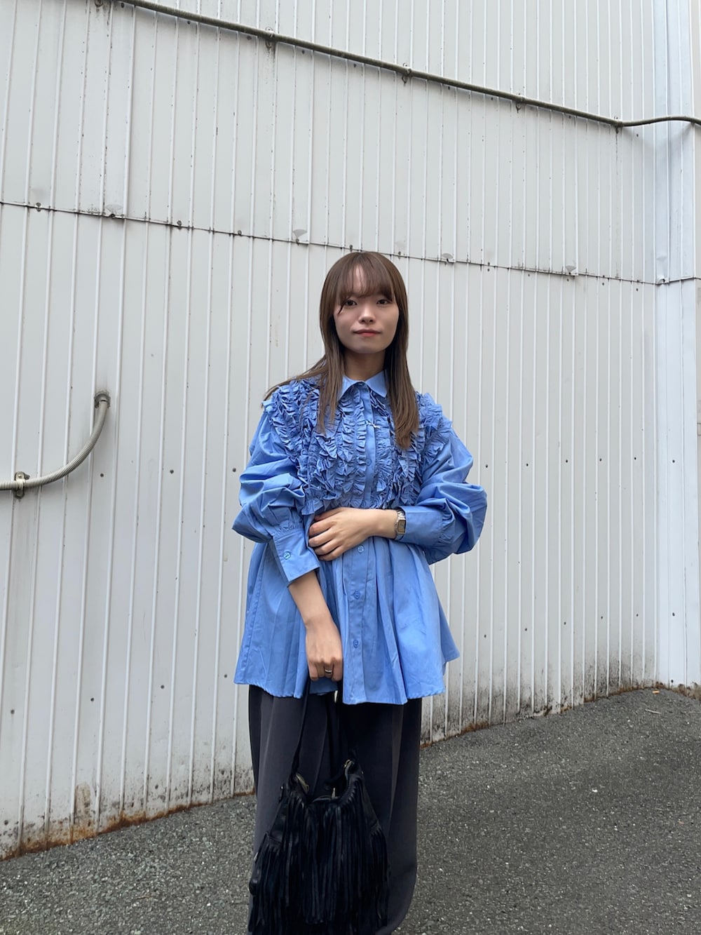トップスのブラウスはフロントがフリルになったデザインで、まるでビスチェを着てるようなシルエットで、一眼引くデザインです✨ギャザーによって裾がAラインに広がる形なので、ワイドなパンツやスカートにも合わせていただきやすいです!