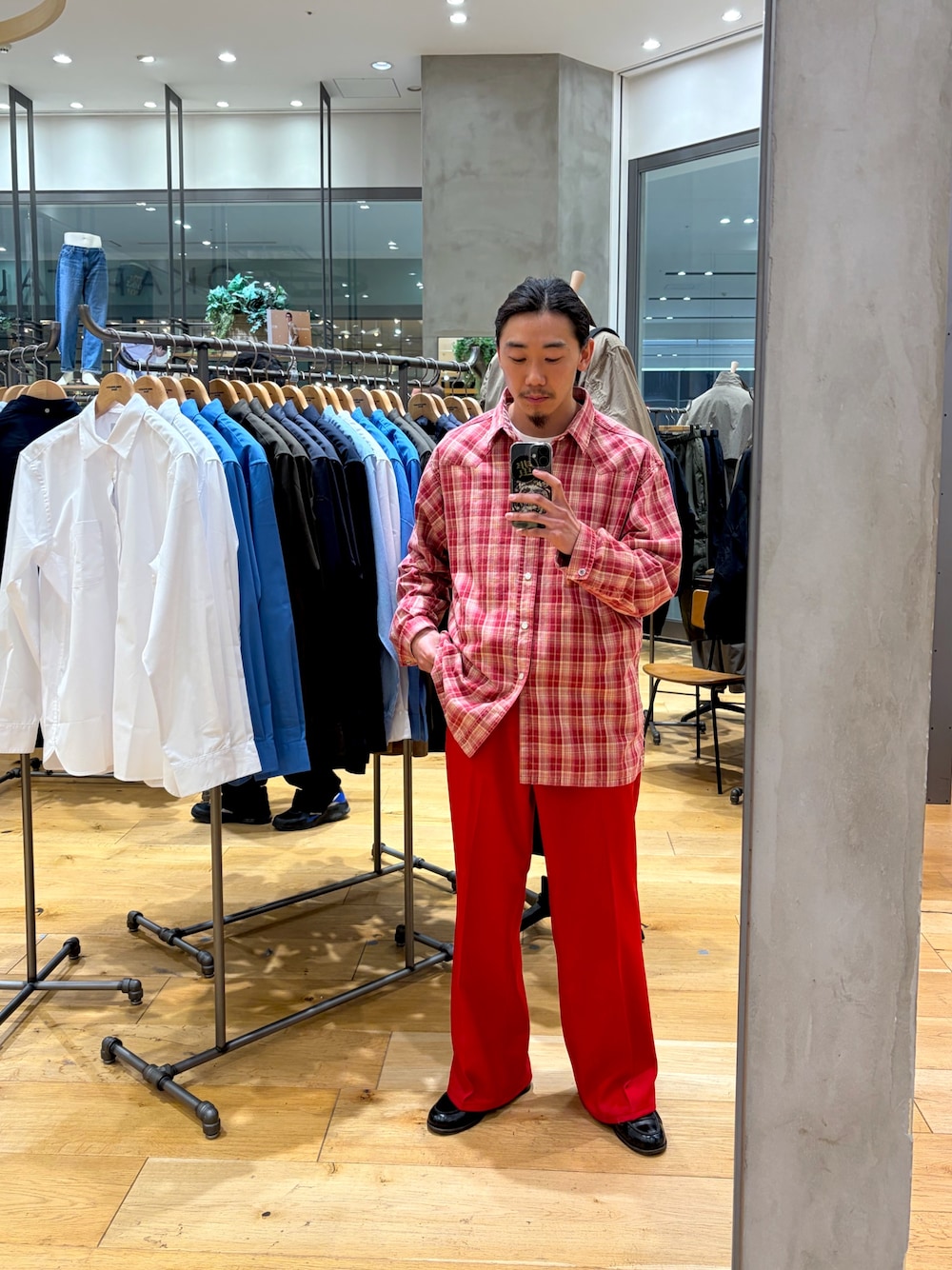 深い色合いで光沢のあるブラウンのシャツと合わせてみました。