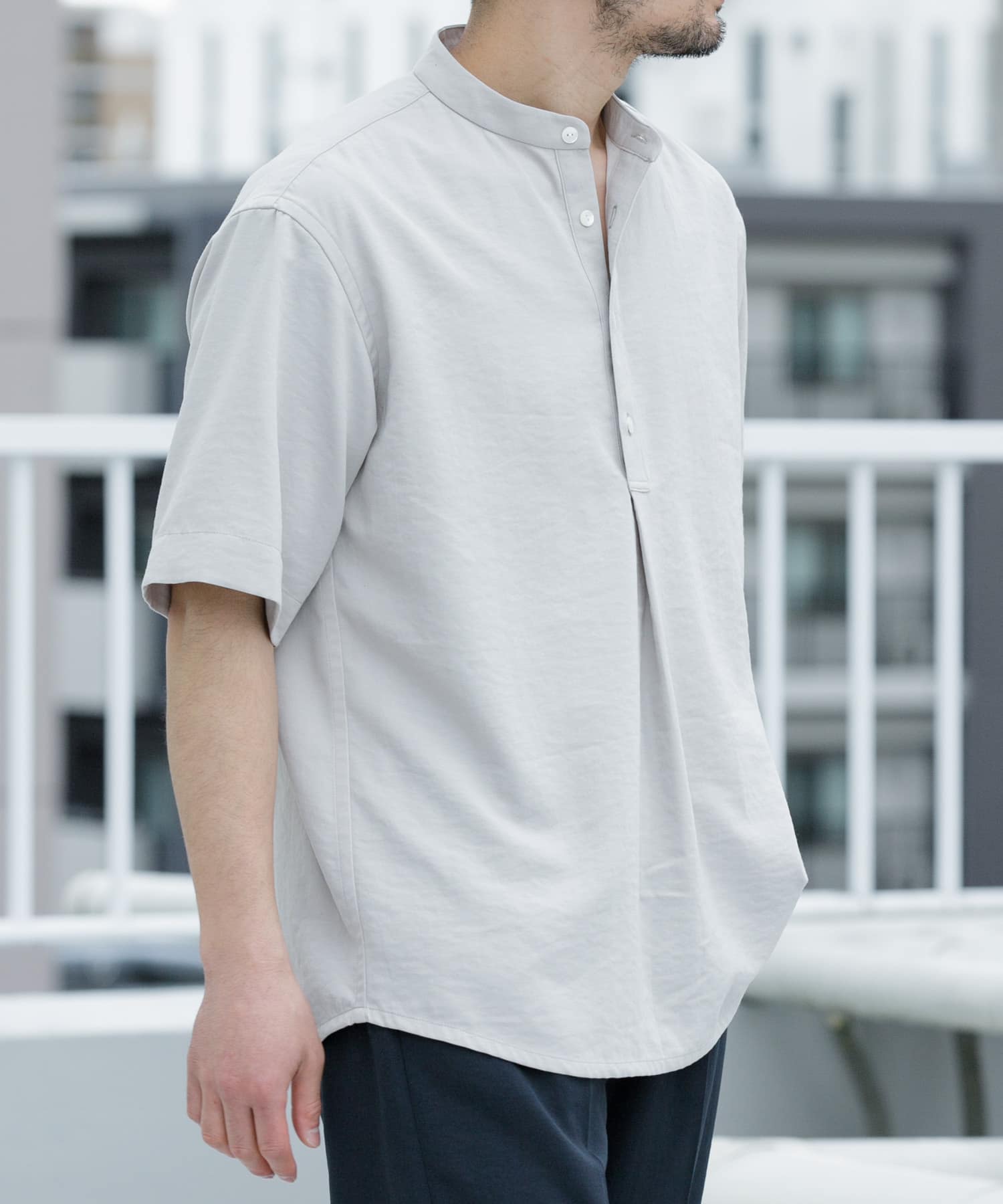 軽やかなリネンライク素材にバンドカラー&プルオーバー、1枚でもインナーを覗かせても様になる優秀シャツ。