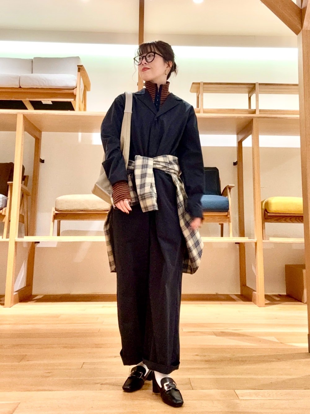 ウエストマークには、チェックが様になるシャツを合わせて存在感をプラスしました‼︎