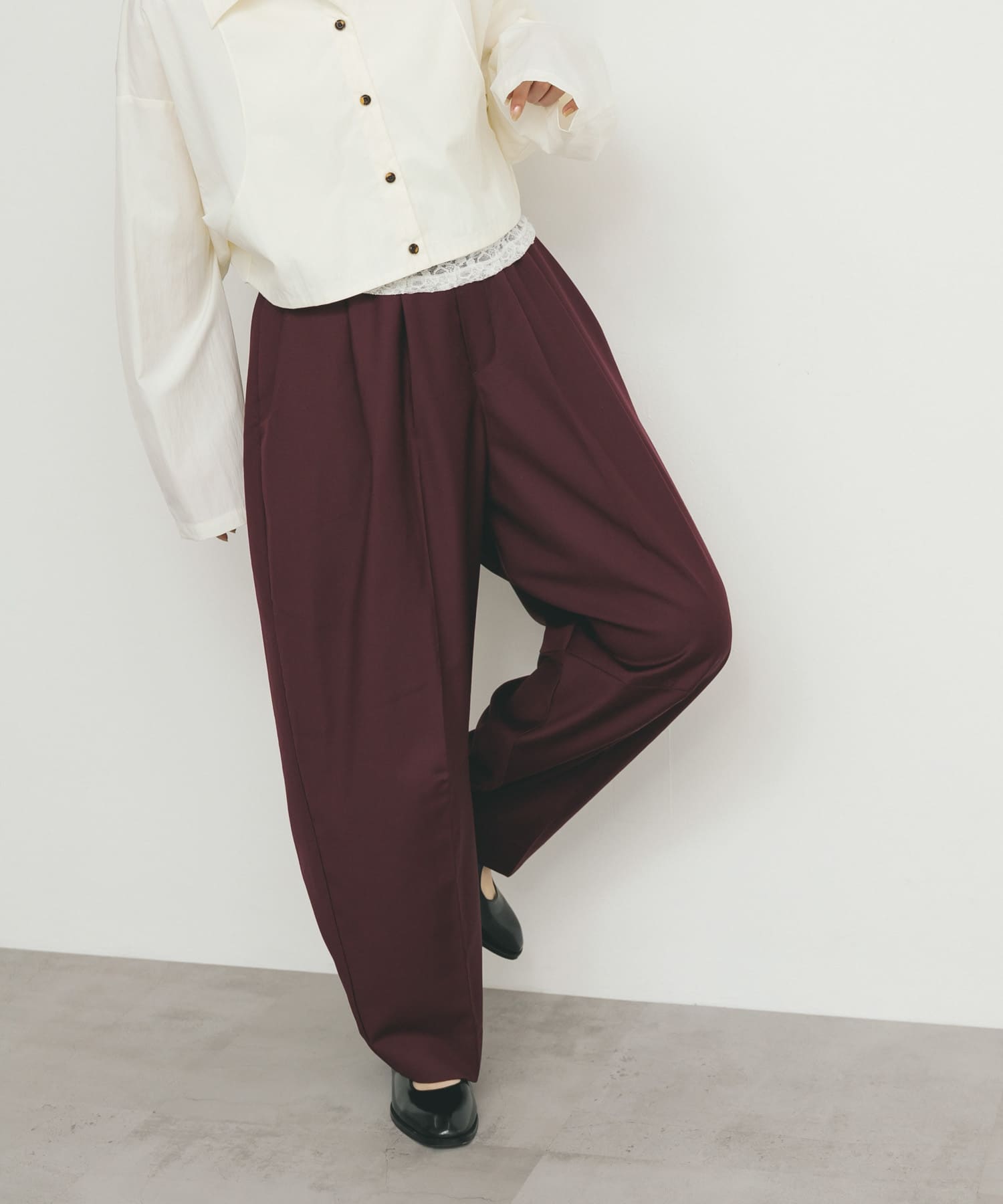 旬なカーブパンツは大人仕様なシルエットと素材で一枚持ってるとトレンドをプラスしてコーディネートが完成します!トップスはショート丈でバランスも取れやすくカラーが可愛いです◉
