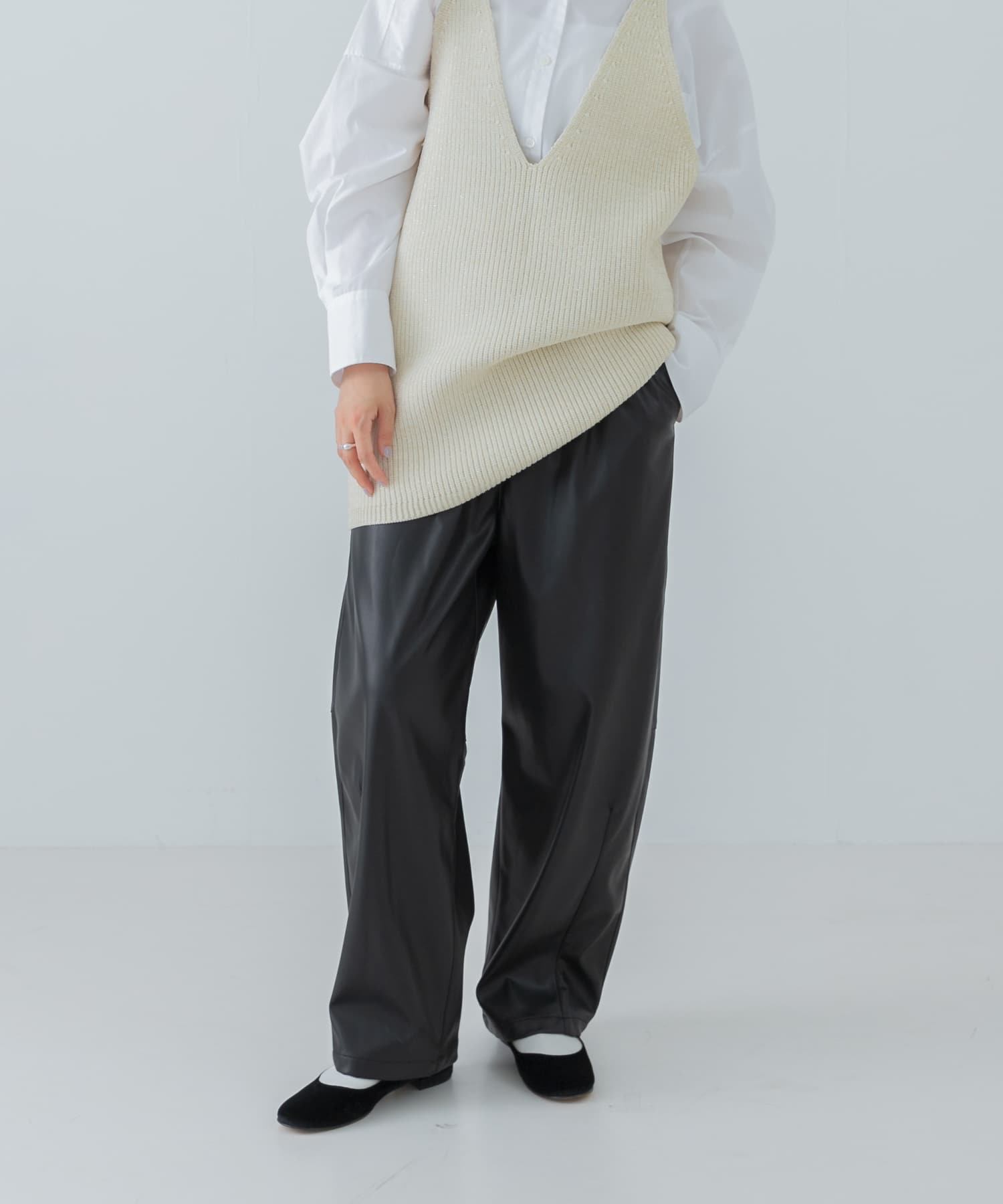 レザーライクのパンツはさりげなくハードすぎずスポーティなアイテムと合わせて旬な装いに◉