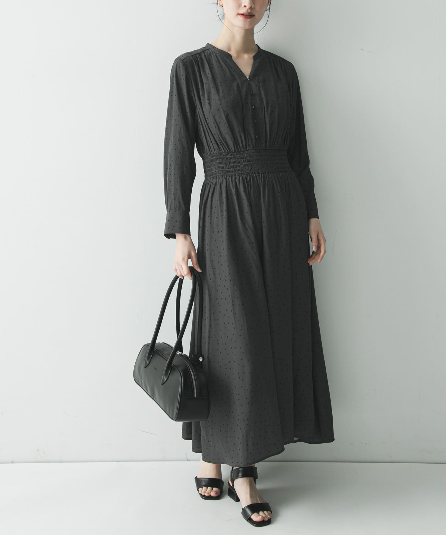 ドットワンピース、ウエストのシャーリングがスタイルアップ効果抜群です◎