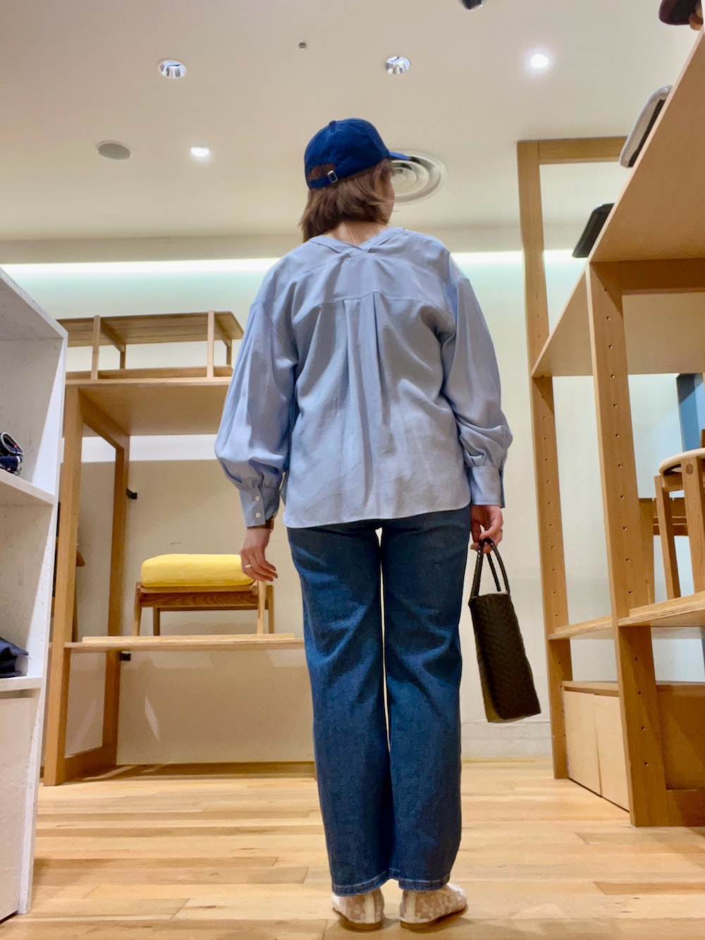 ブラウスはデザインがありボタンを少し開けてタンクトップと合わせ抜け感を出しました‼︎襟ぐりがスッキリしていて中のタンク等も映えカラーも楽しめます‼︎