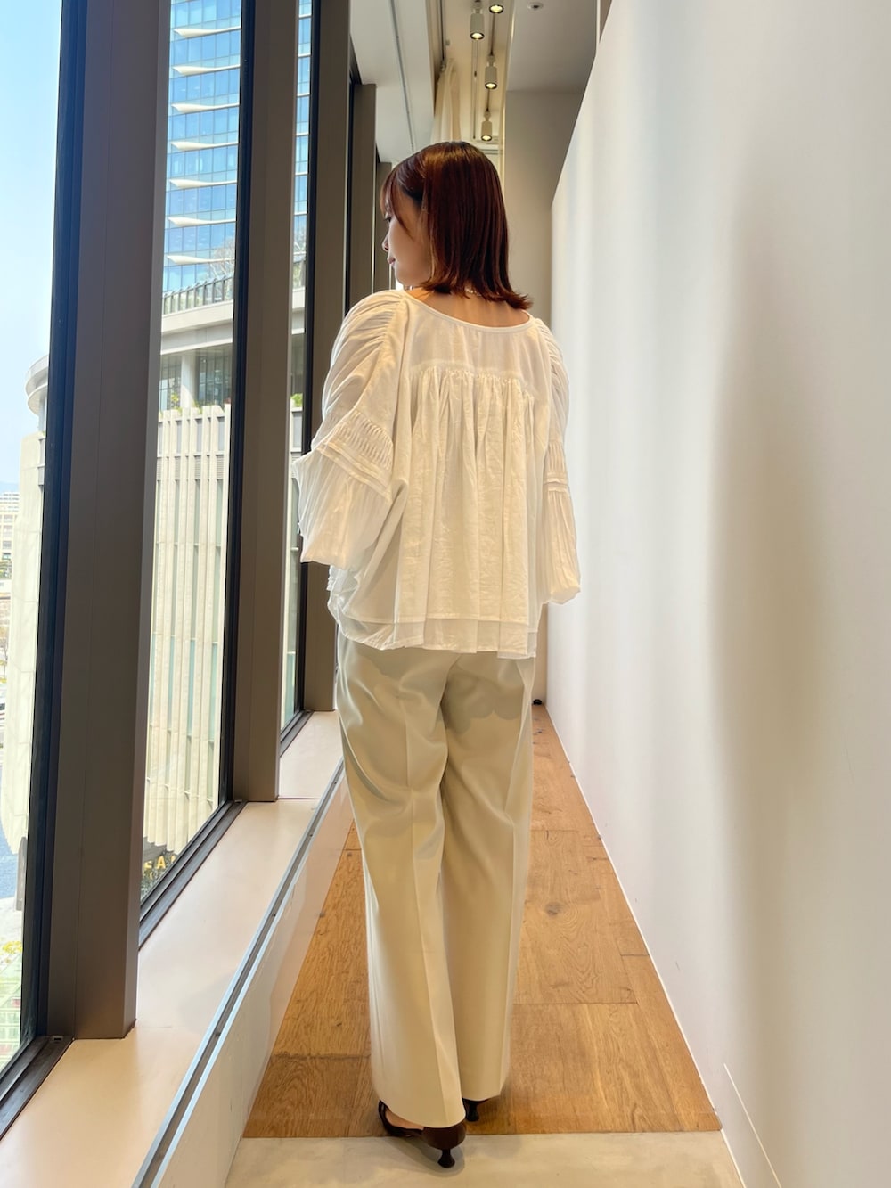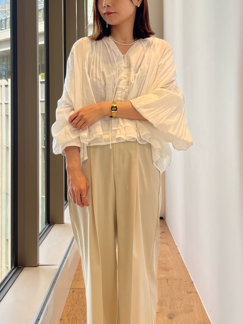たっぷりのギャザーと袖のボリューム感がスタイリングに味をつけてくれます◎