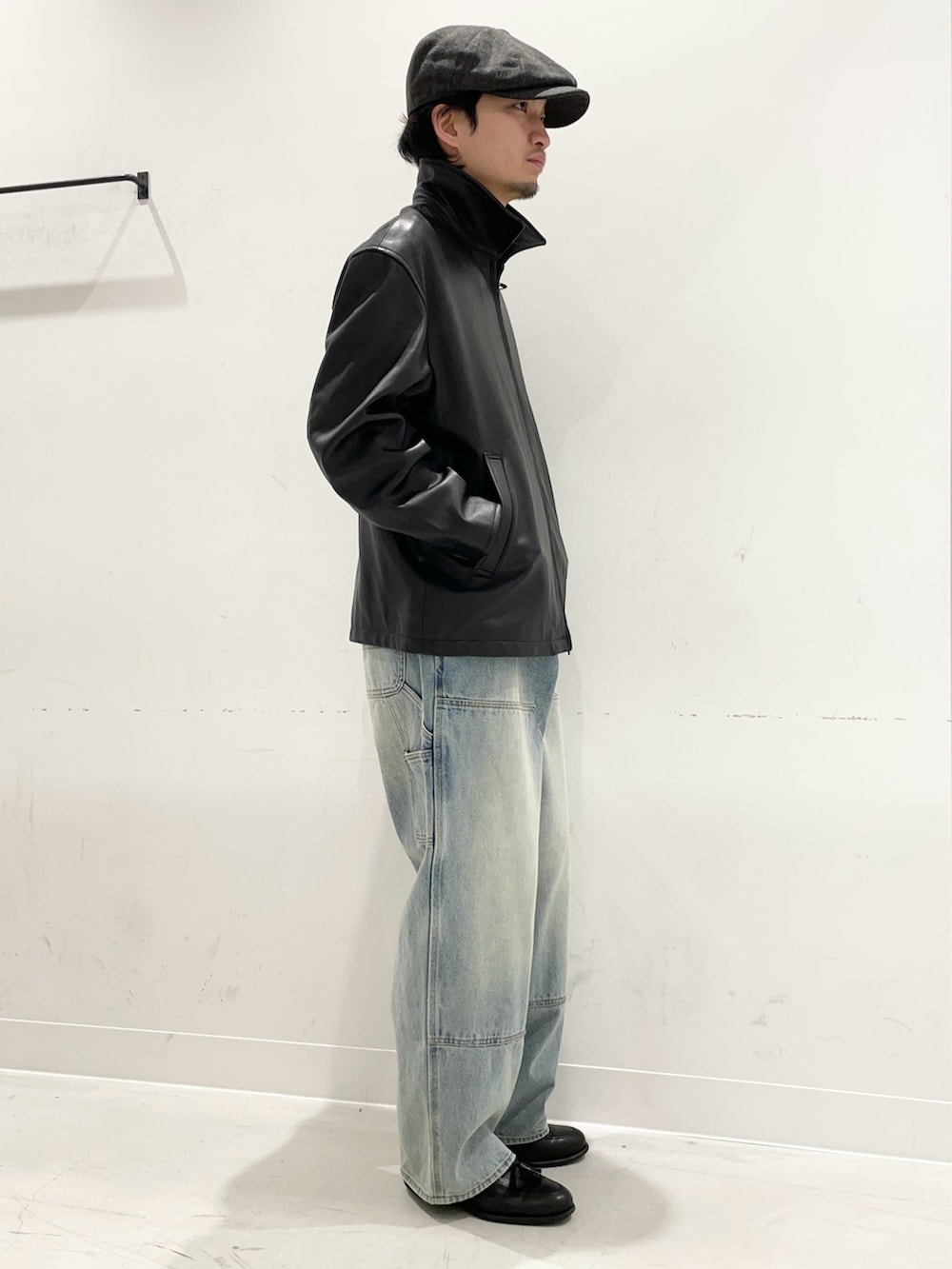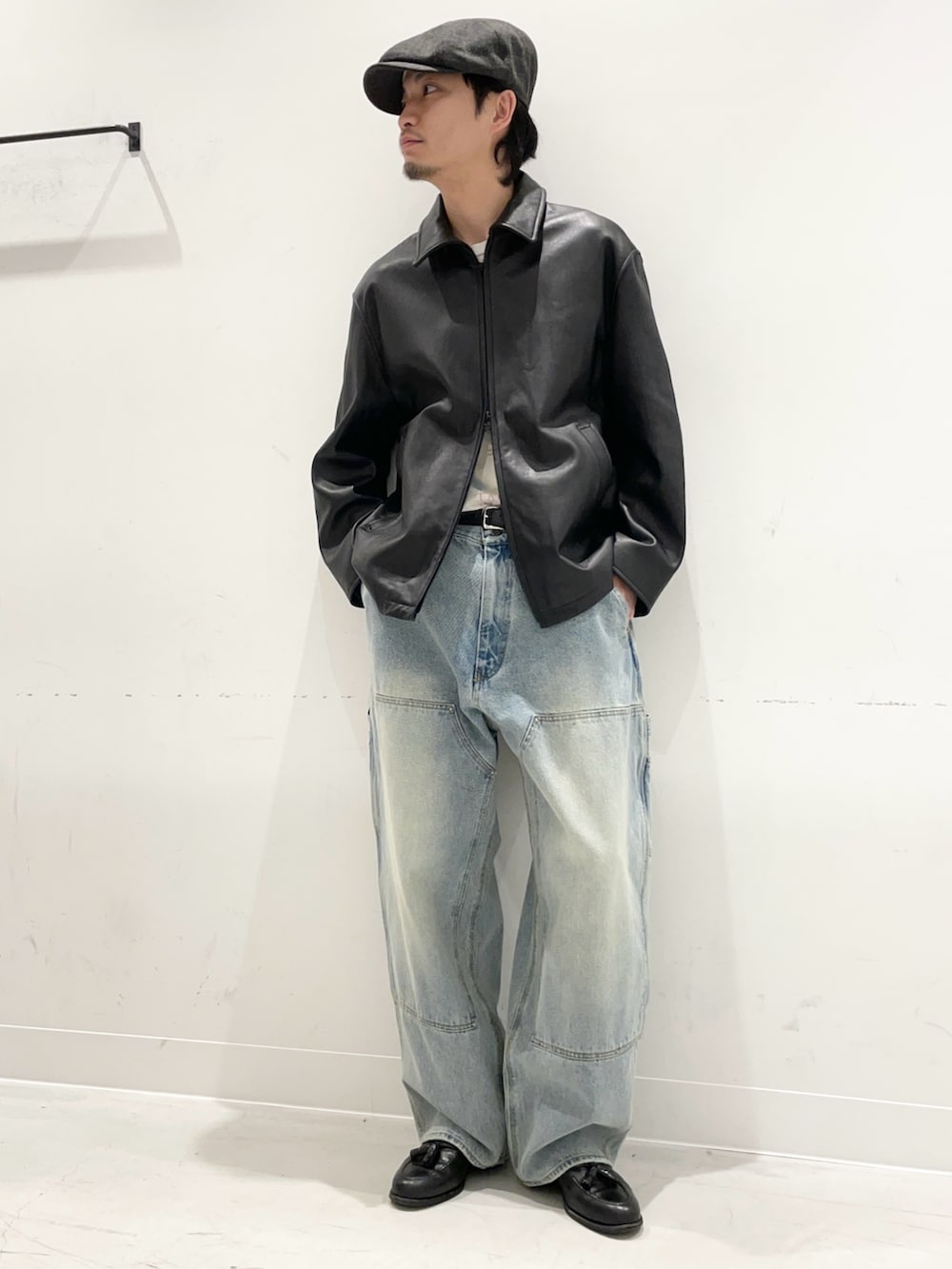 レザーにデニムにキャスケット。