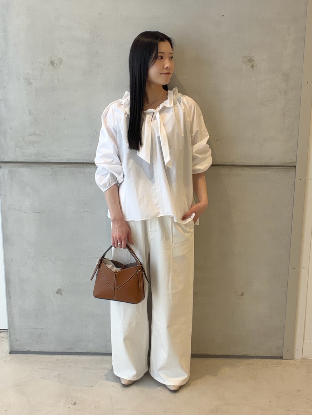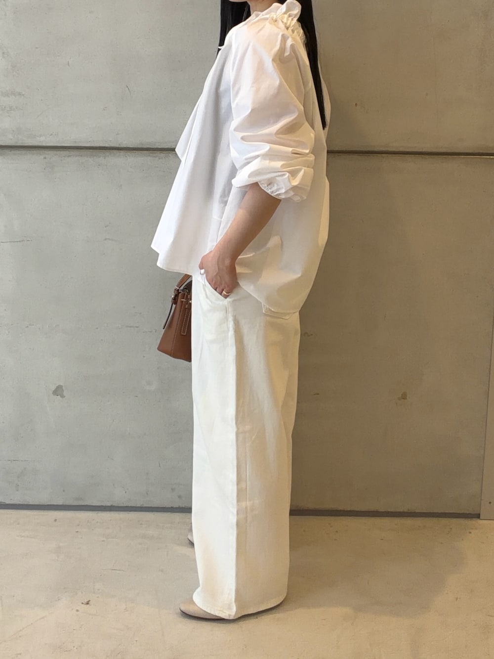 身長157cmで、サイズ36でも38でも着れますが、スニーカーで合わせていただく場合、36の方が床につく事なく着ていただけます👖