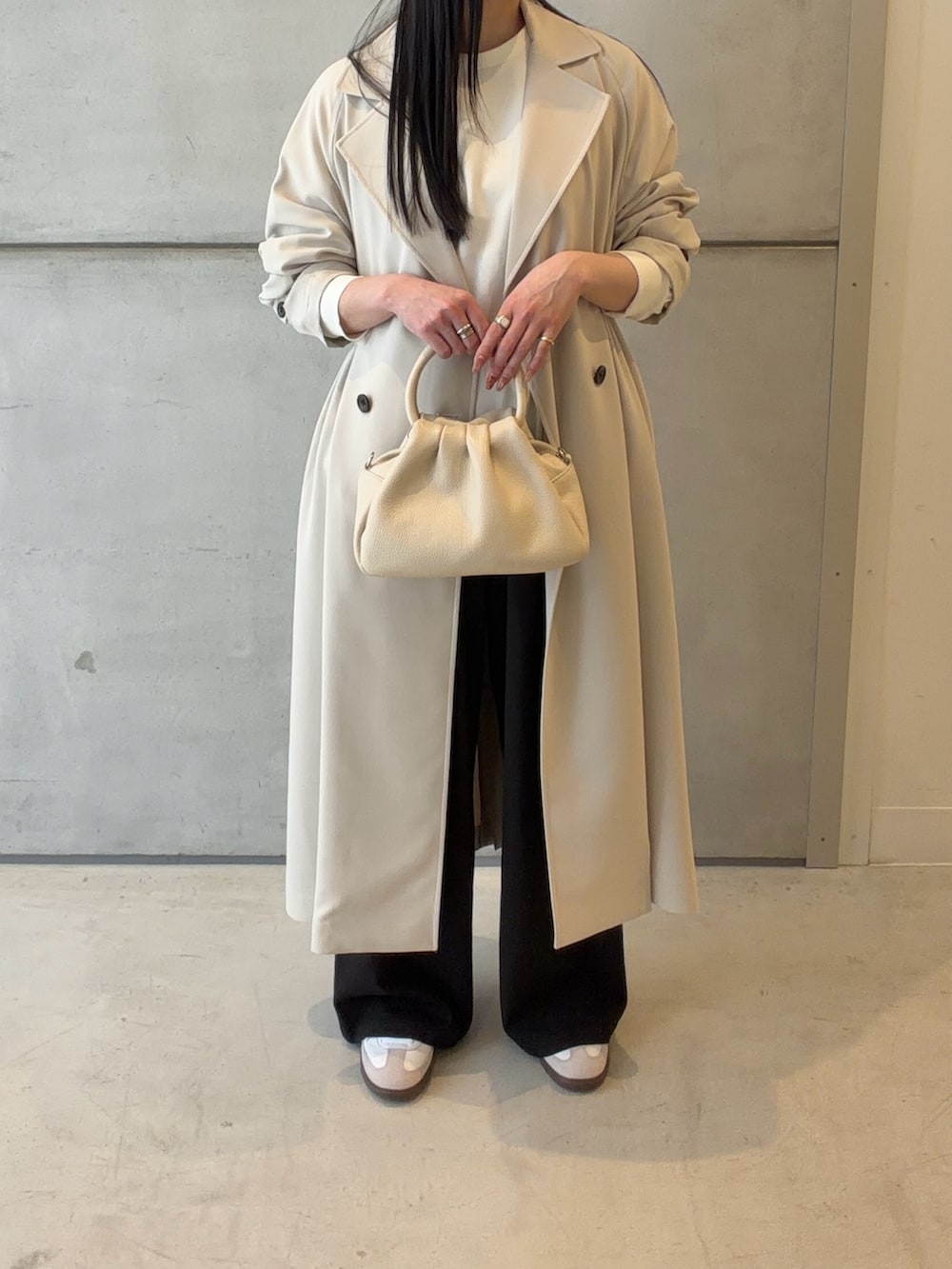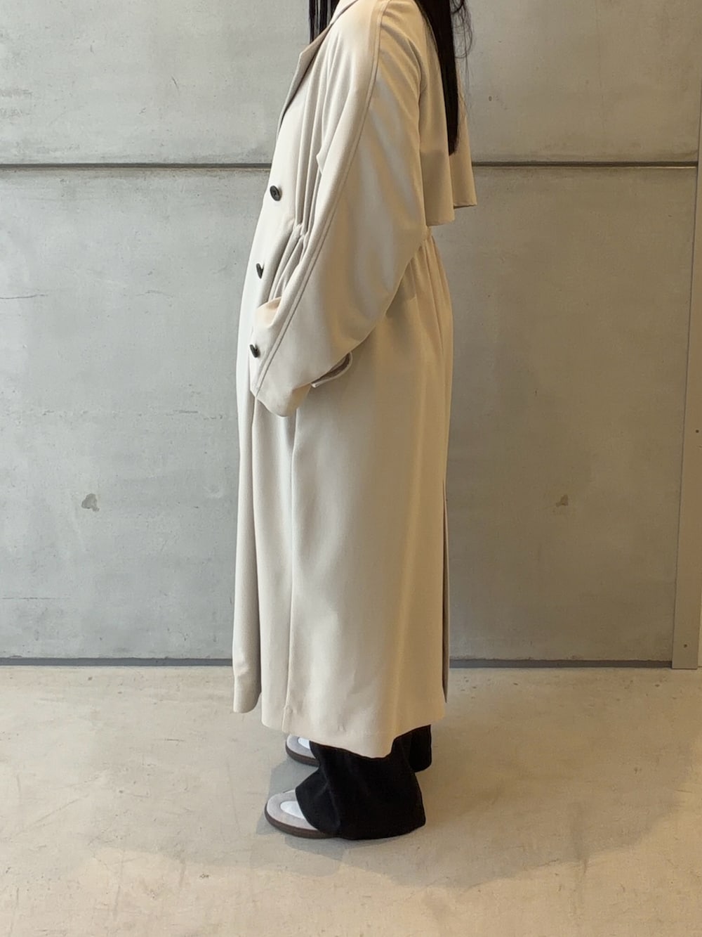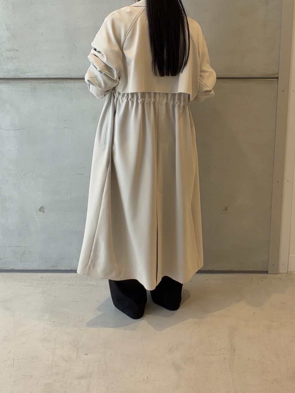 トレンチコートはウエスト位置で中にドローコードが付いているので、自由にシルエットを変えていただけます✨
