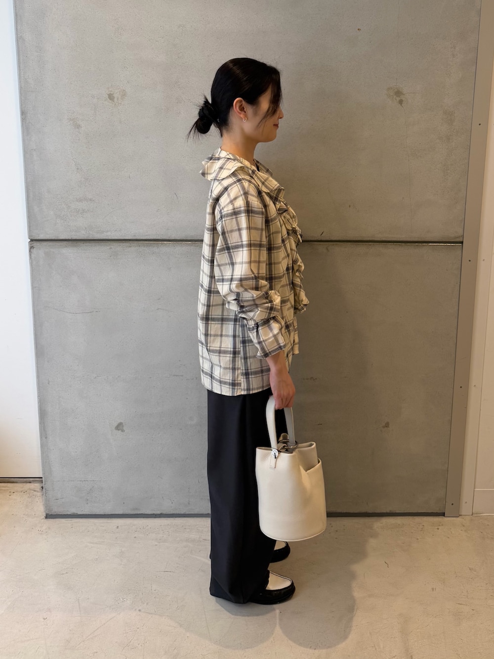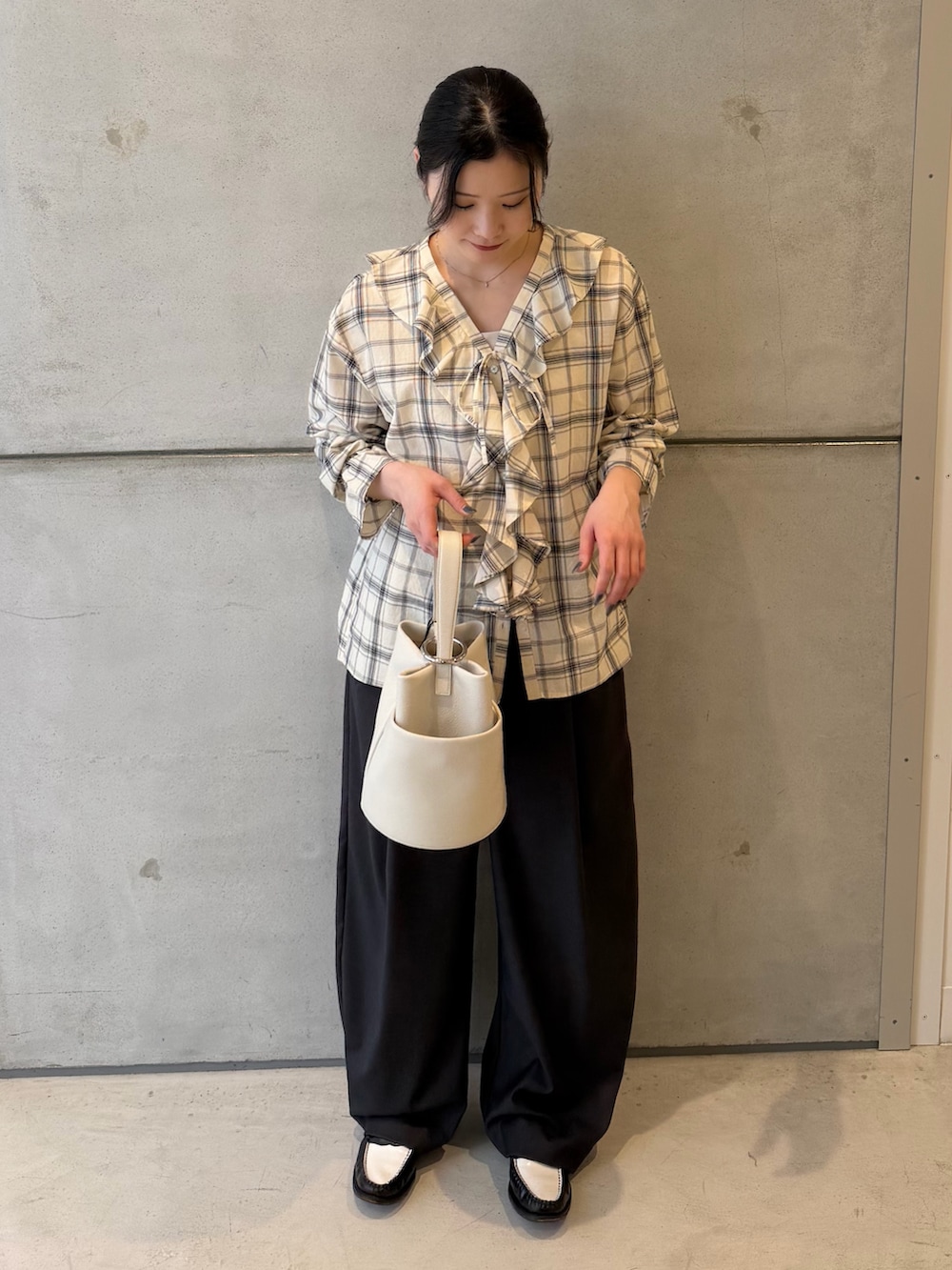 フリルブラウスにはボタンがついているので下のボタンを開けてウエスト位置が見えるように着る着方が、スタイルアップ効果が出るのでおすすめです✨