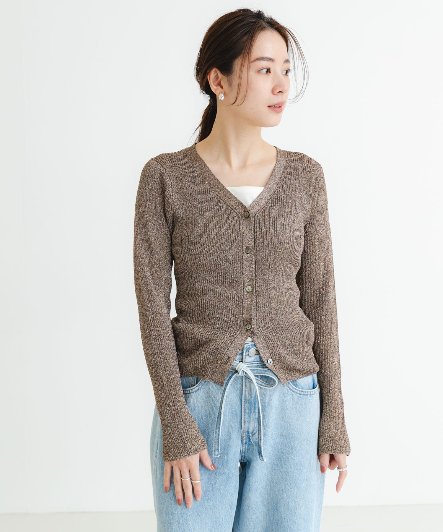 ラメのカーディガンで、さらっと羽織っていただくだけで、雰囲気のあるコーデがしていただけます🙆🏻‍♀️
