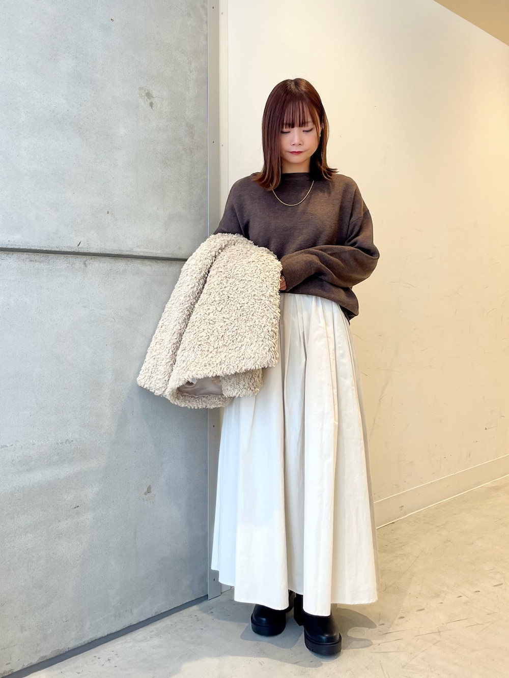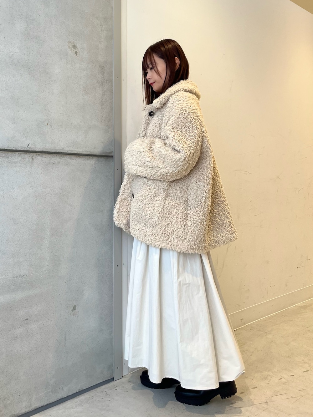 ボリュームのあるスカート合わせでもより女性らしく、可愛いくまとまります◎