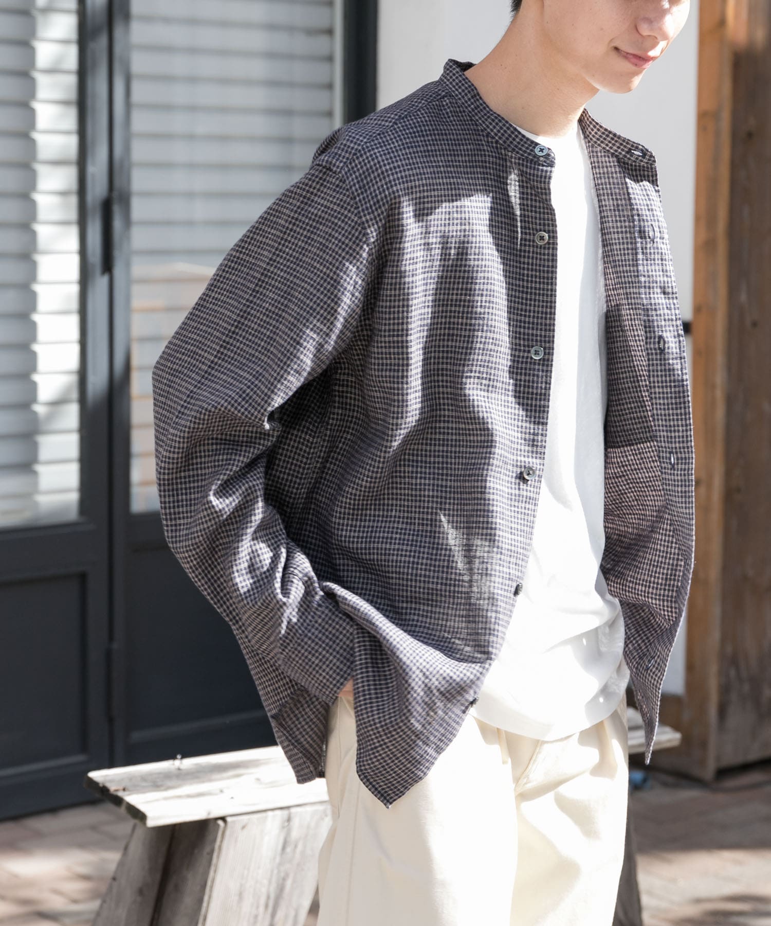 コットンとリネンを使ったチェックシャツです。今の季節にぴったりの素材感です。上品さを感じる色味と雰囲気です。パンツはセオアルファ吸水速乾でこれから暑くなってきたら大活躍しそうです。