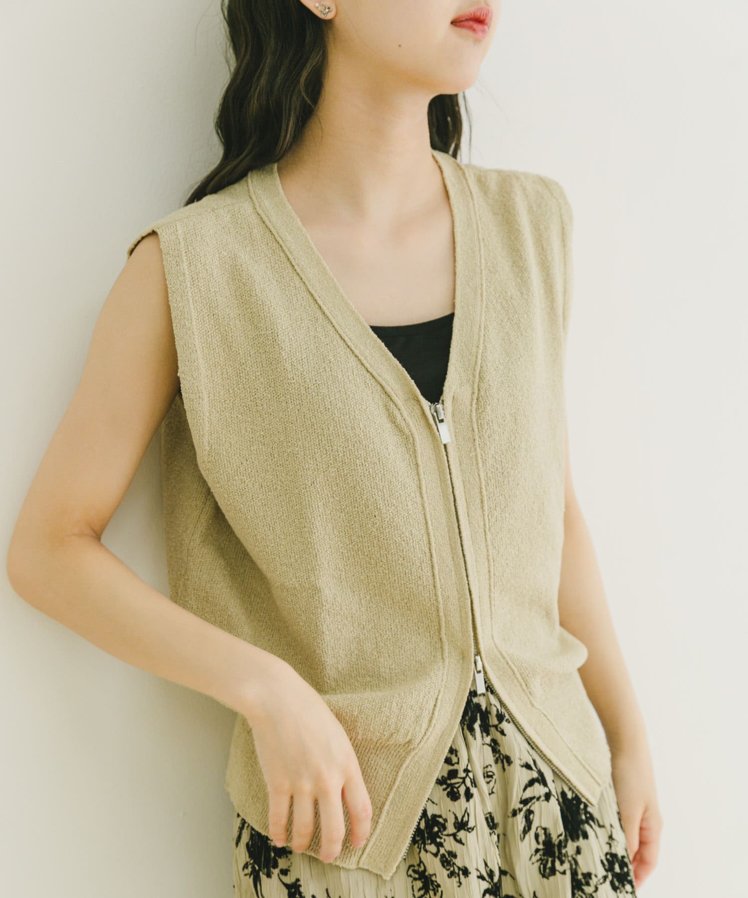 トップスはジップベストでダブルジップになっていてシルエットがとても綺麗なアイテムです!色味も可愛いく1枚で着てもTシャツと合わせて着ていただいても可愛いと思います!