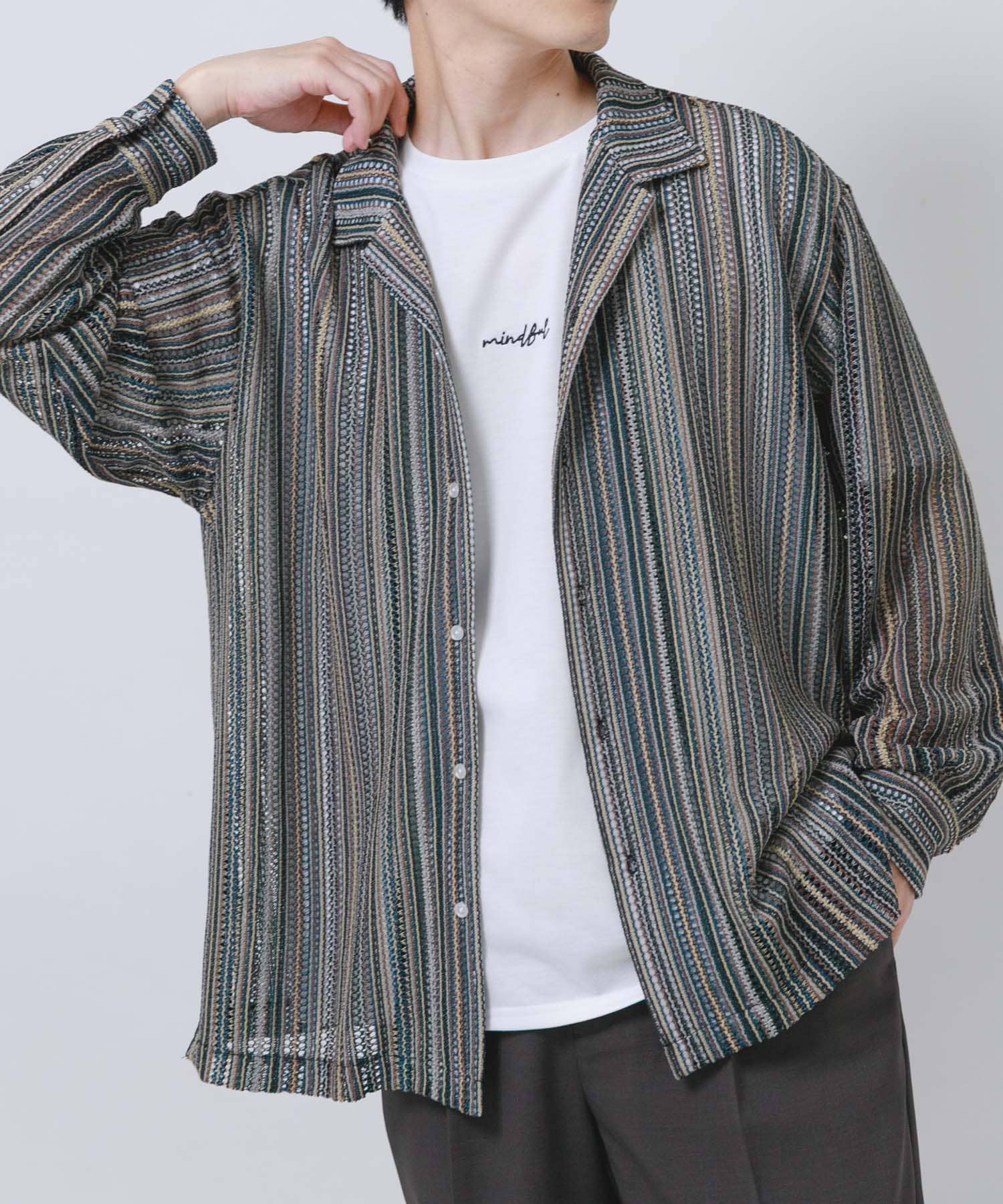 マルチストライプレースオープンカラーシャツ