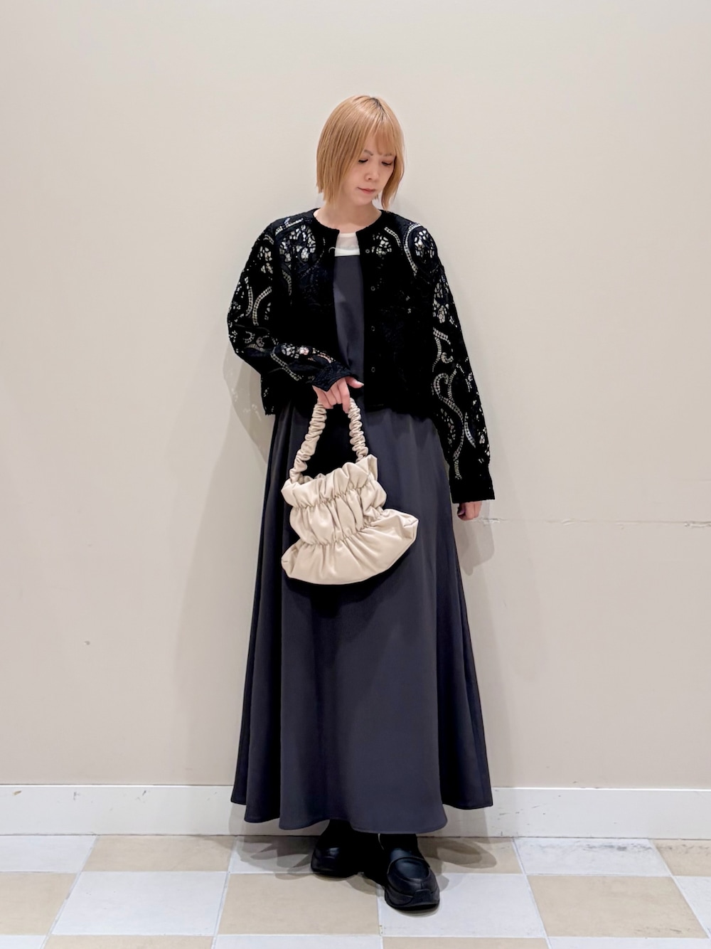 ハイネックでゆったり着れる5分袖のブラウスにしっとりした質感がキレイなプリーツスカートを合わせて、きれいめにスタイリングしました!