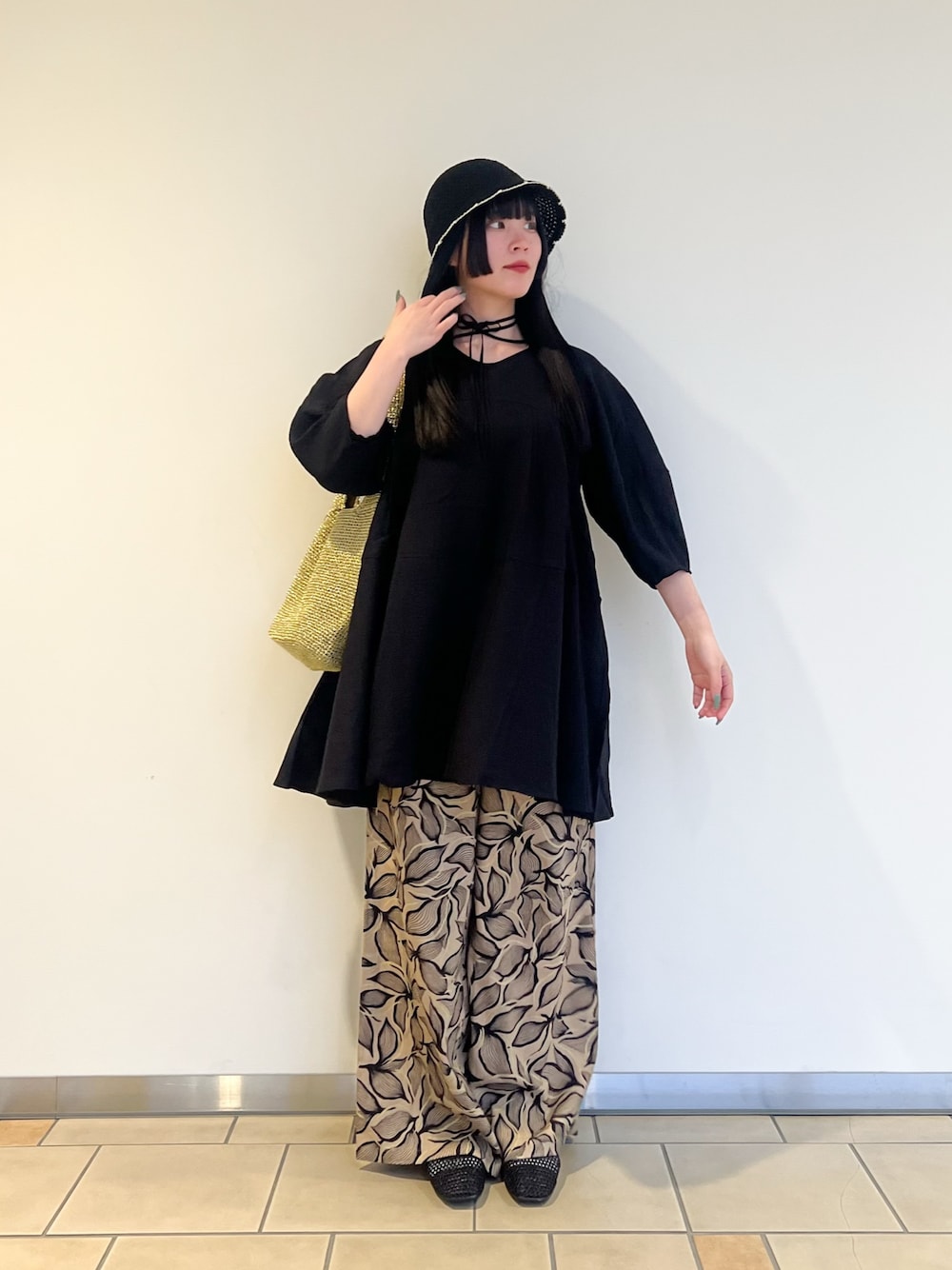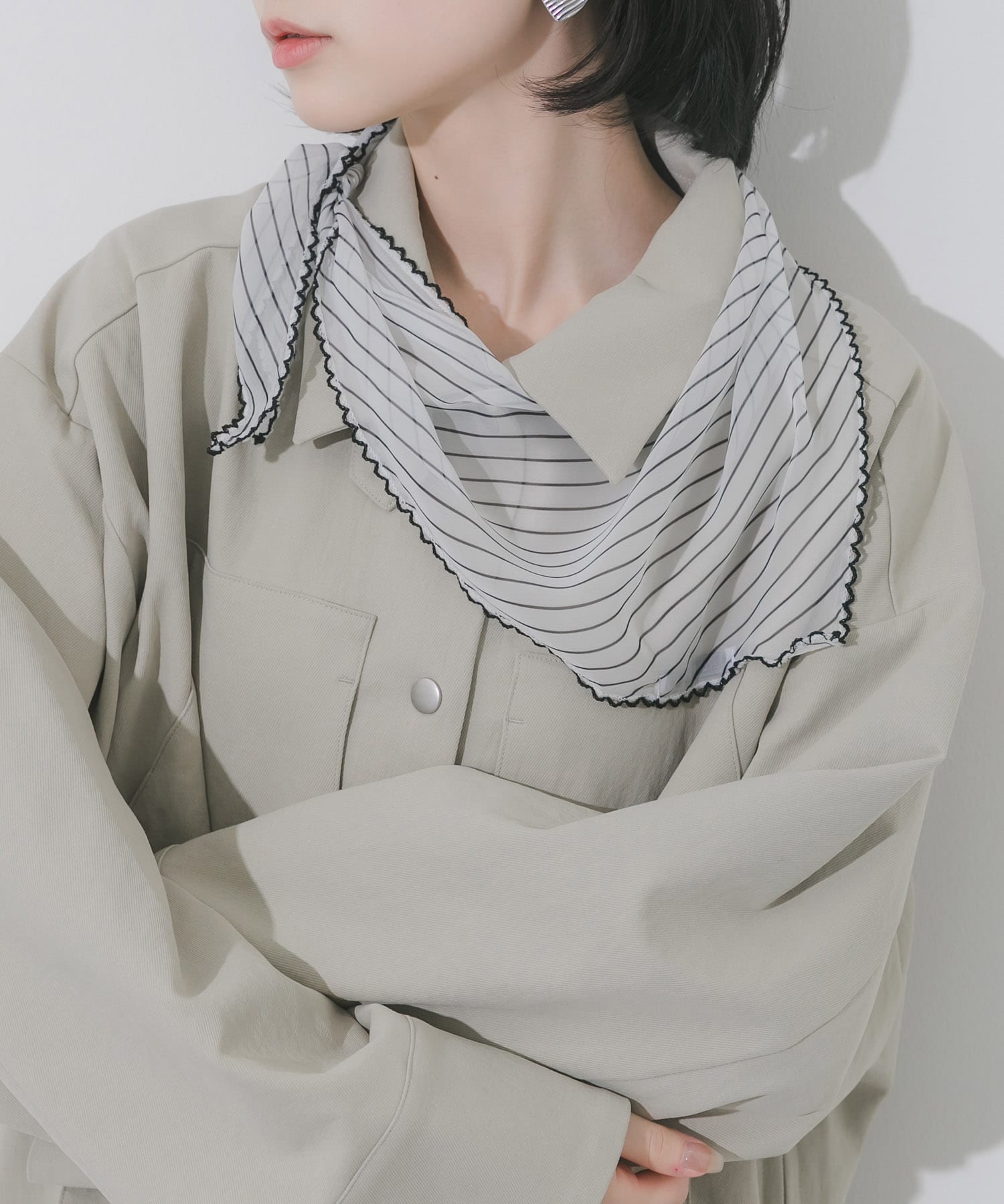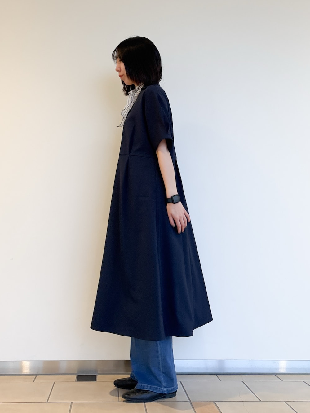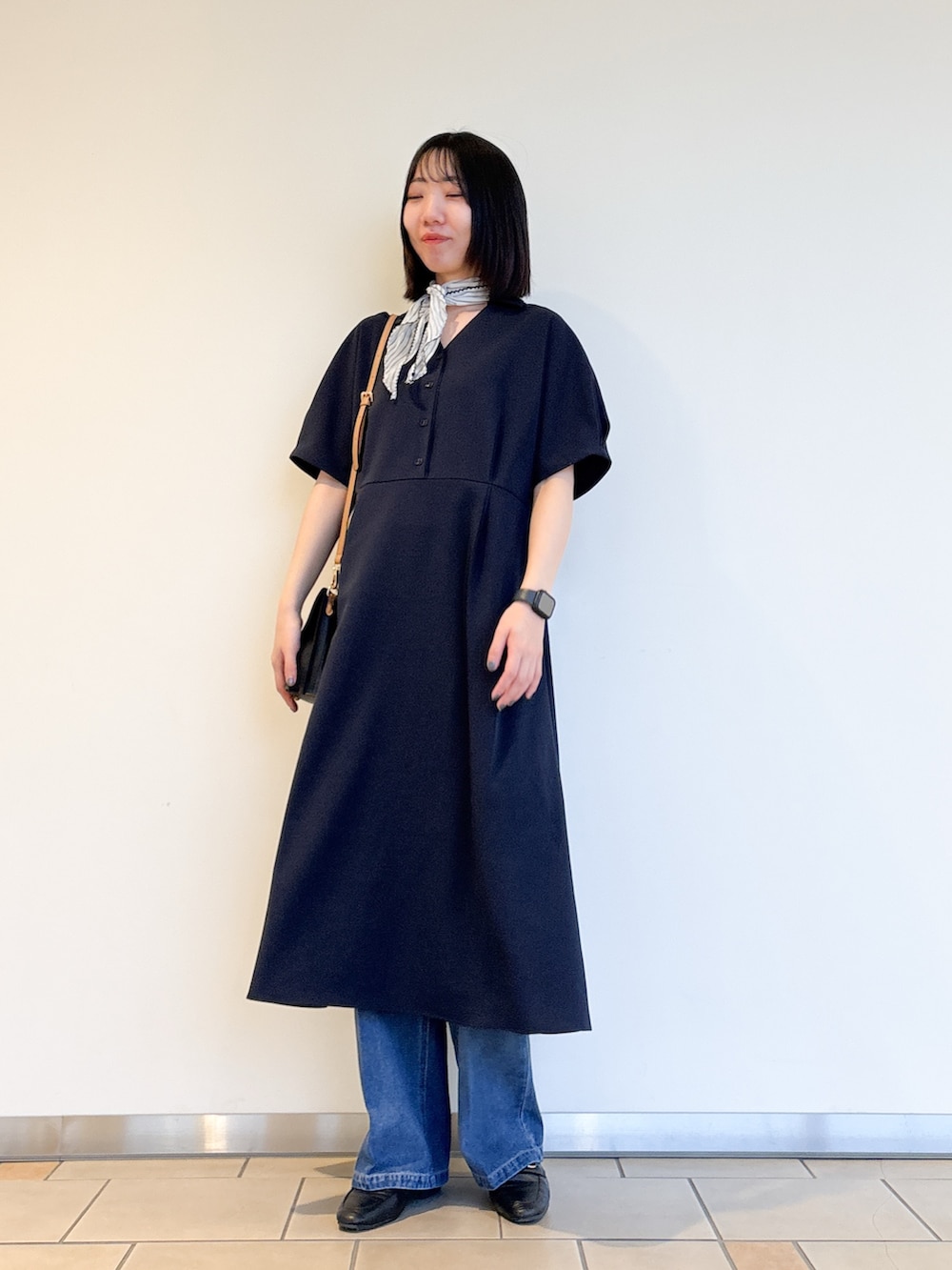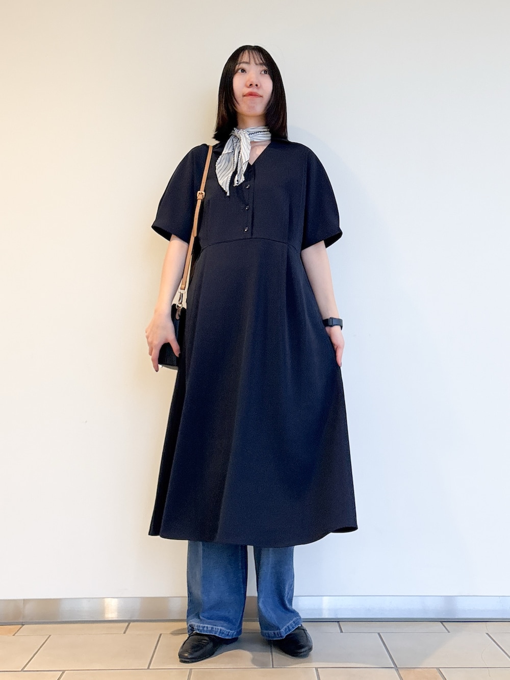ウエストの切替で自然にスタイルアップ。襟付きで首周りが少し開くので、スカーフを合わせました^^