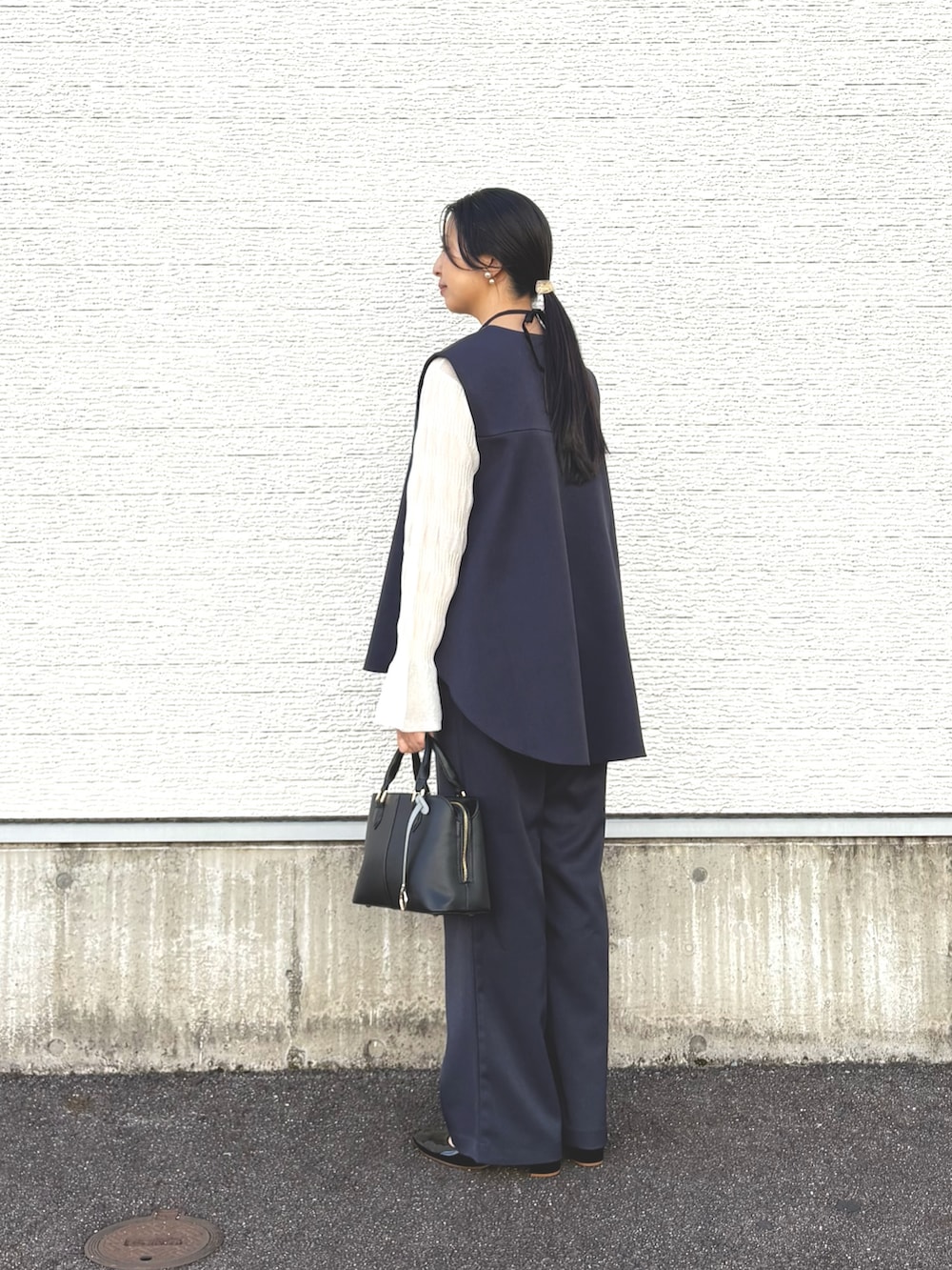 セットのカットソーをニットに変えてもバランスよく決まり、きちんと感と快適さを両立できる頼れるセットアップです。