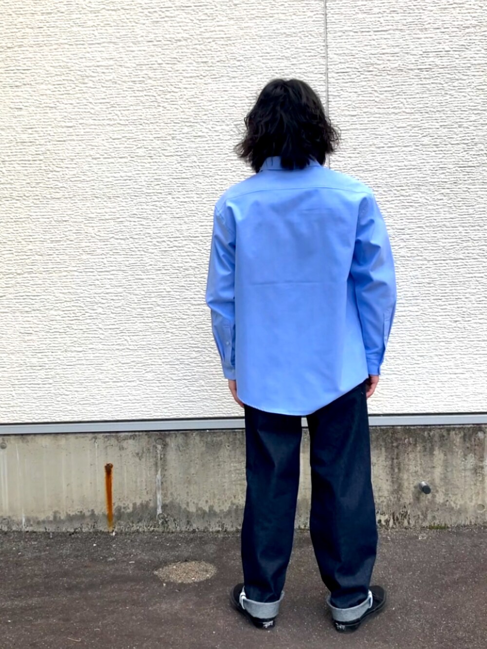 春らしさを意識しブルーのシャツを着て、パンツをデニムにして、靴をスケートシューズにすることによってストリートのスケートボーダーのようなわんぱくなイメージで遊び心を足してみました