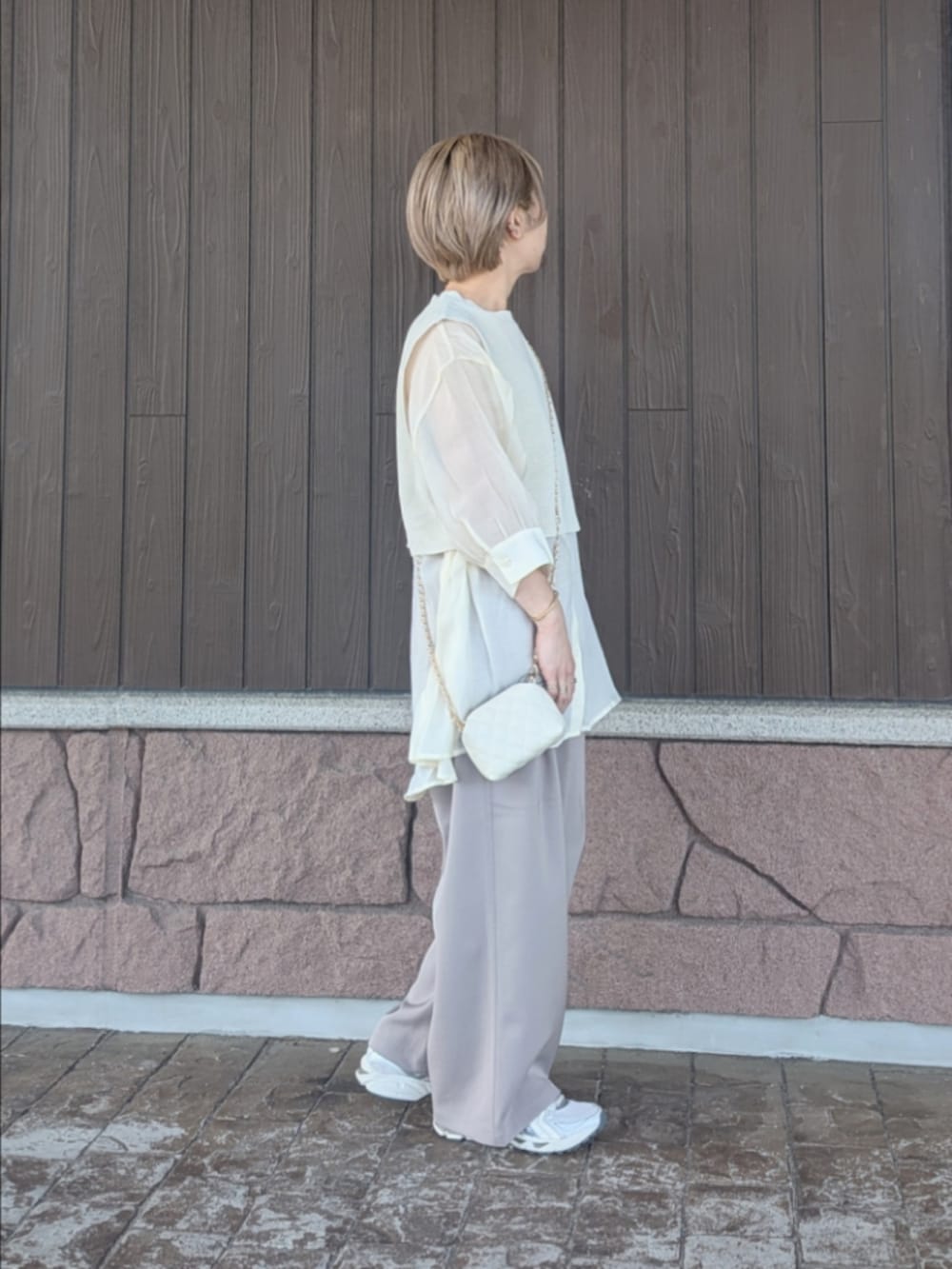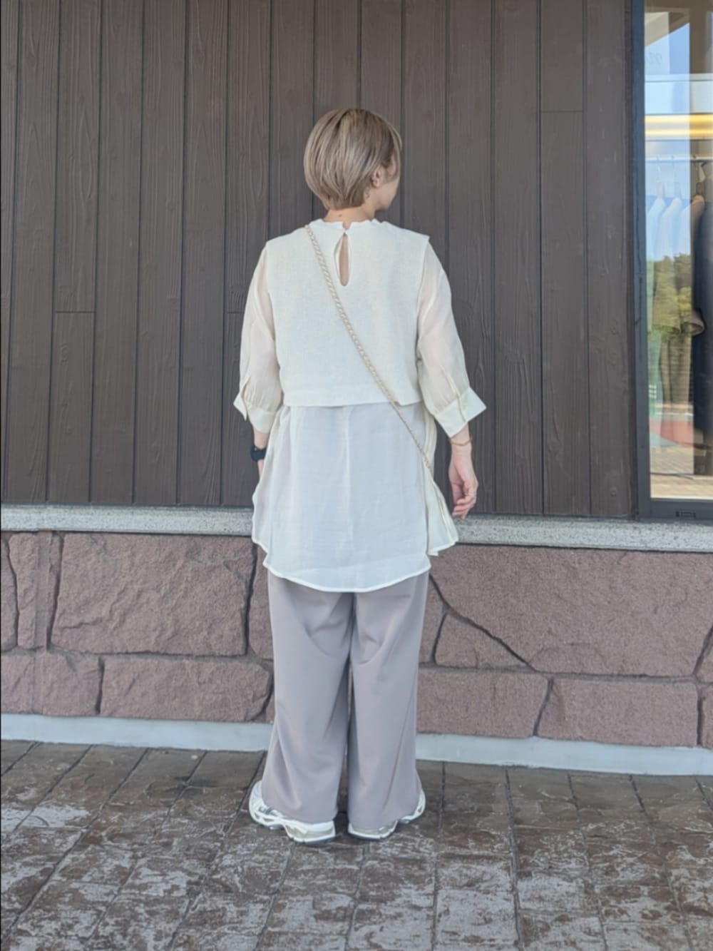 ボトムは夏でも涼しく着れる涼感パンツ。