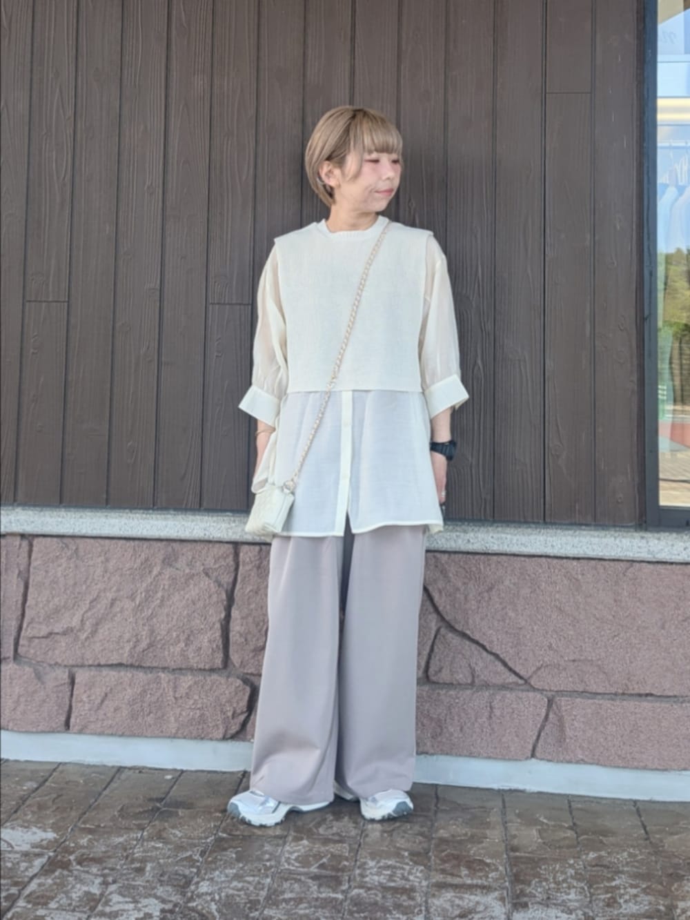 何枚も重ね着せずに完成する便利なアイテムでスッキリ見えします◎
