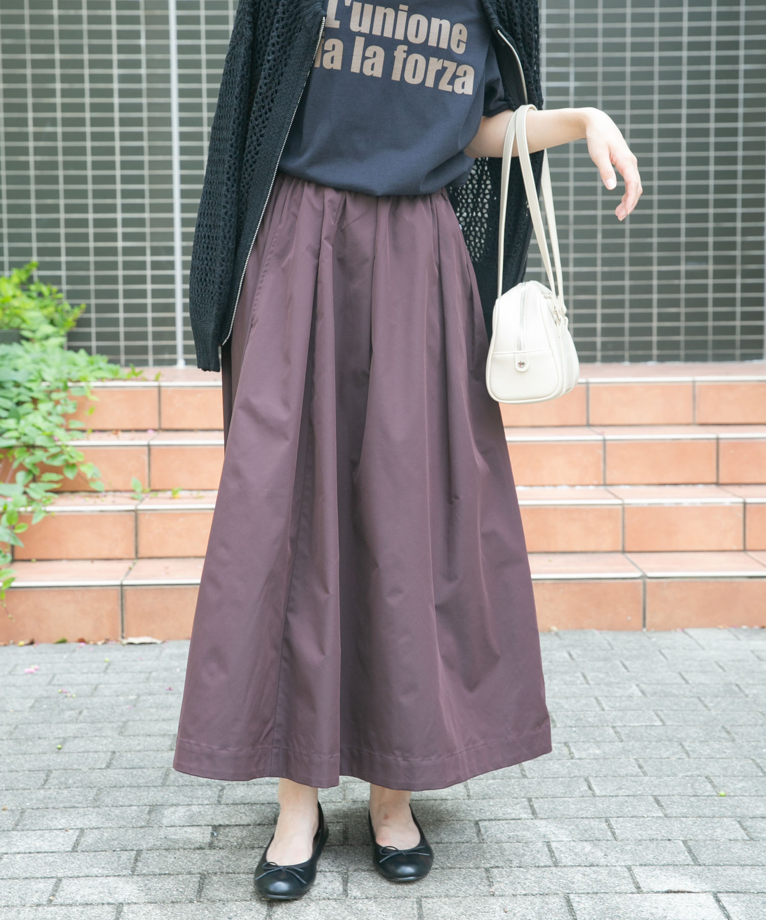 ウエストゴムで楽な履き心地のスカートはふわりと広がる女性らしいシルエット