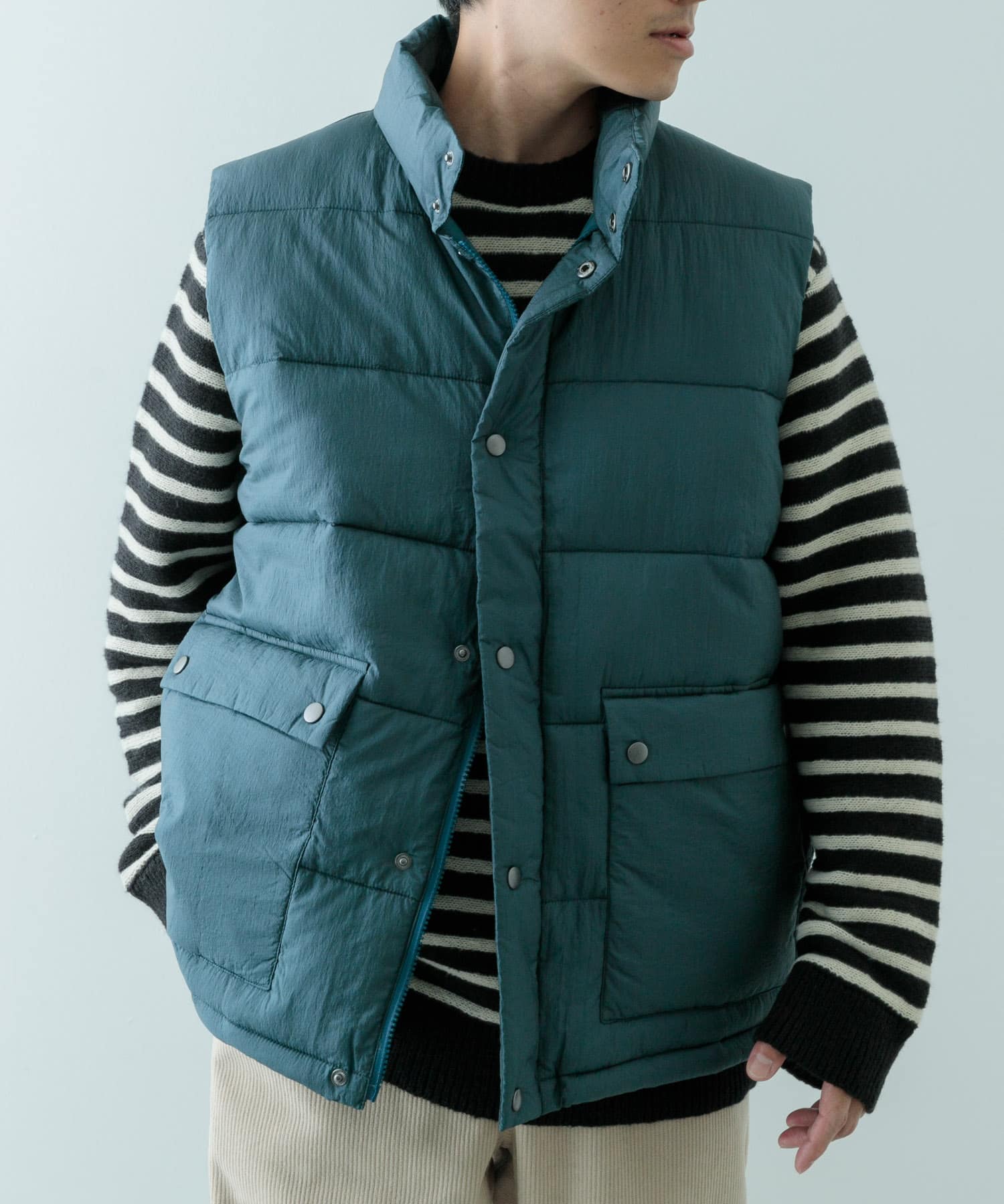 ベストは発熱機能が付いており軽量で暖かさのある中綿アイテムになります。