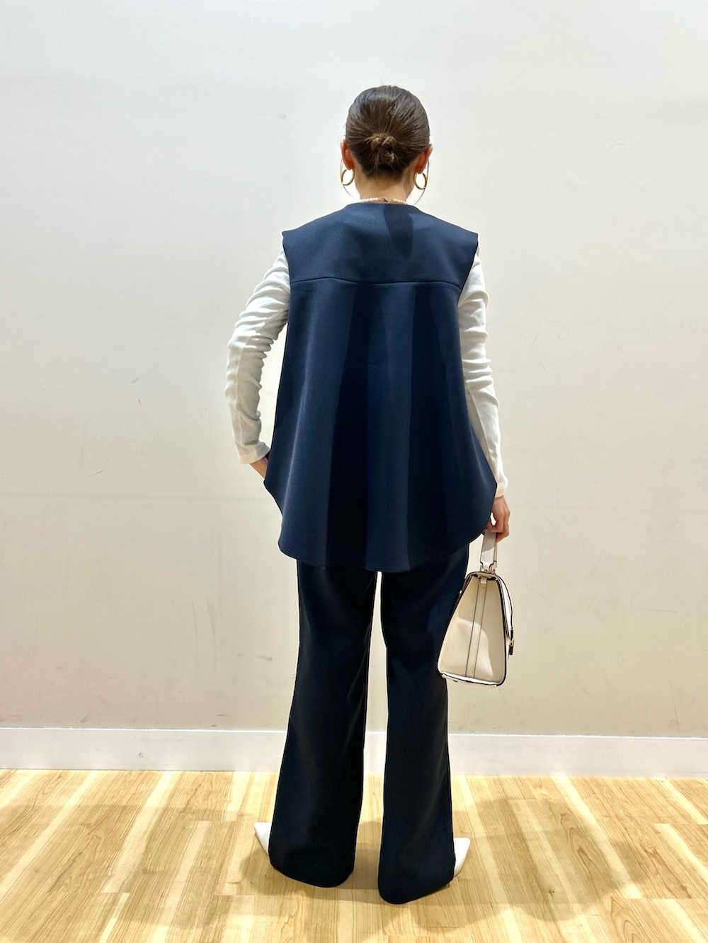 ふわっと広がるノースリベストはお腹周りカモフラージュ