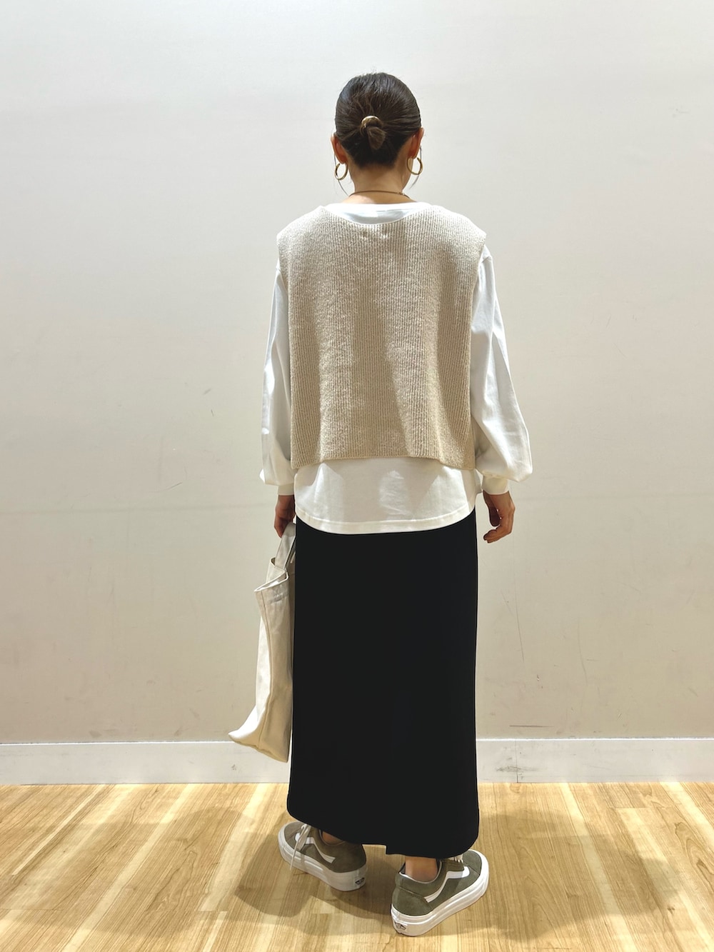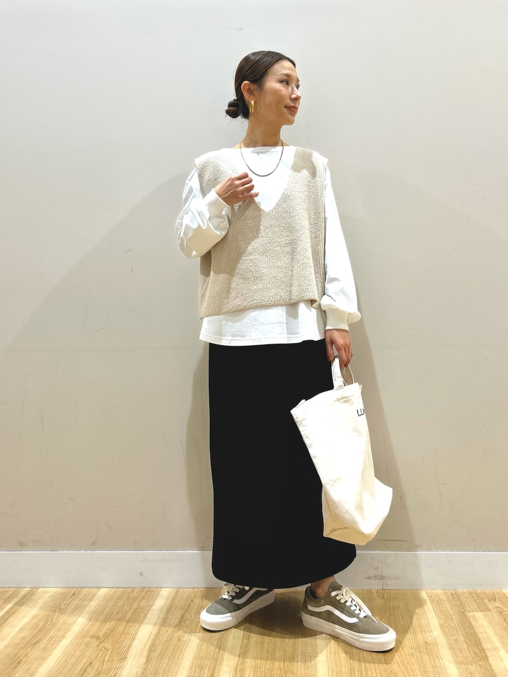 中に着たニットベストとロンTのセットは