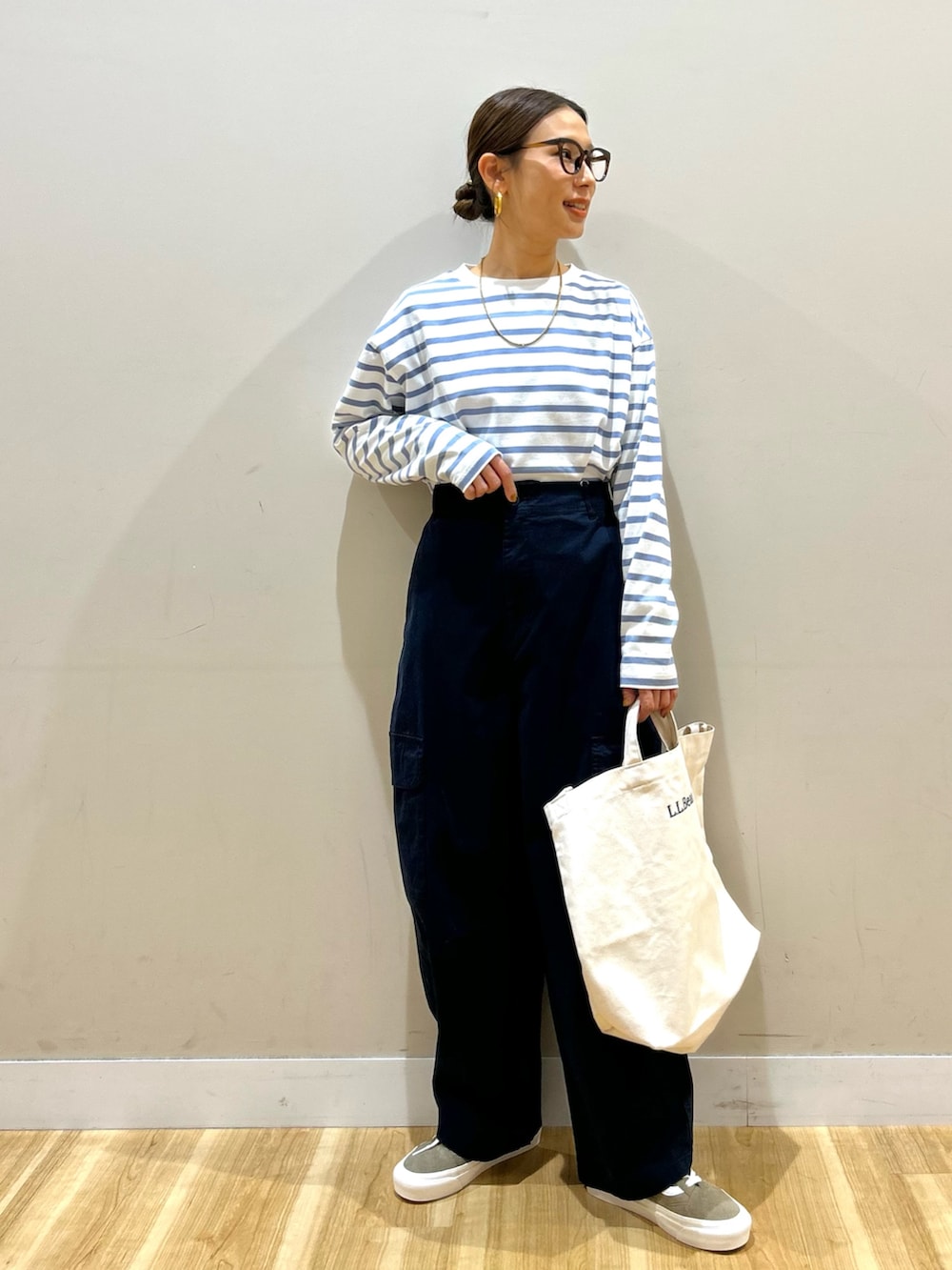 ネイビーの清潔感とカーゴパンツのカジュアル感が絶妙な可愛さです。