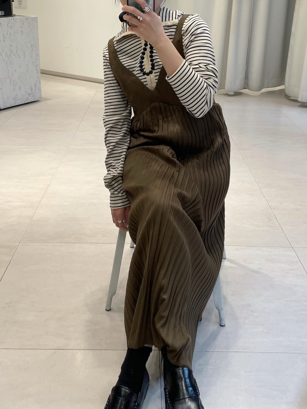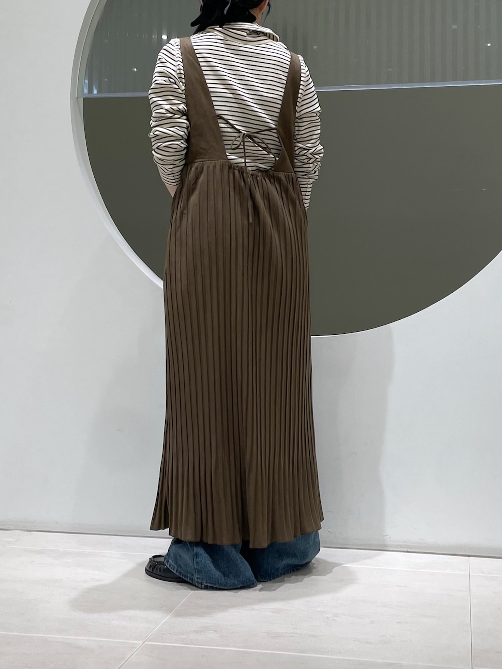ワンピースは身長151cmの私で36を着用しています。1枚はもちろん、デニムとのレイヤードスタイルもおすすめ。