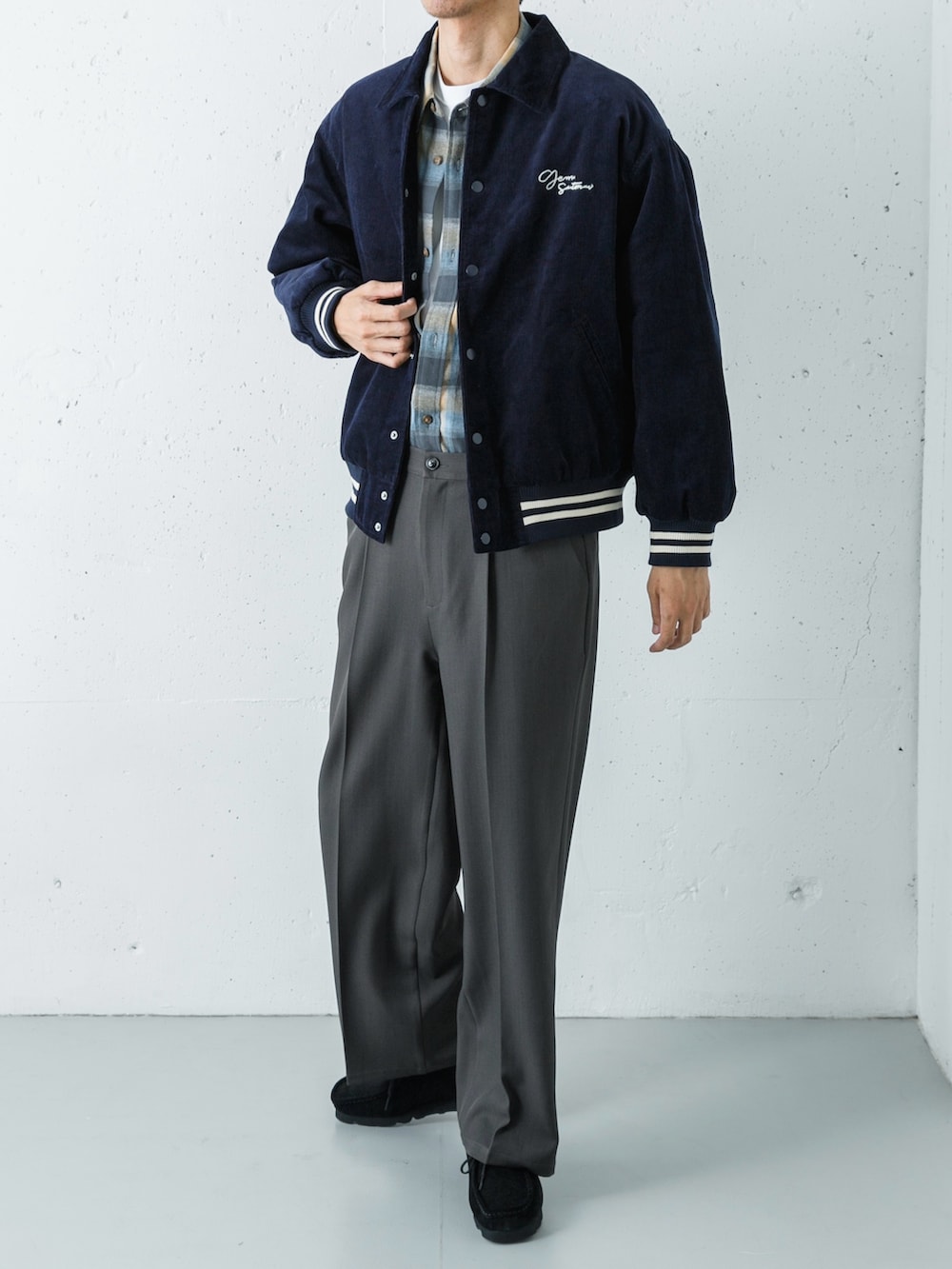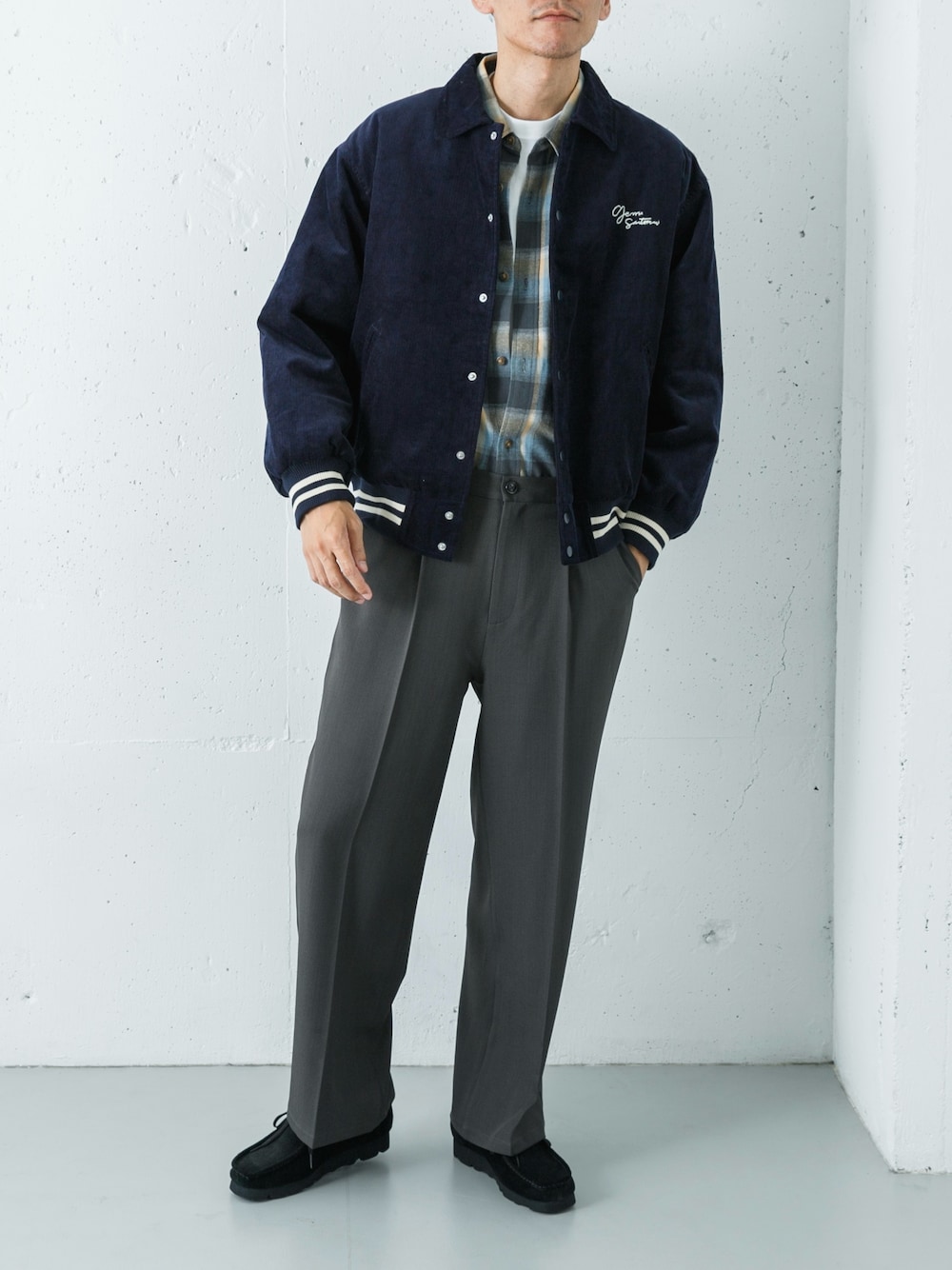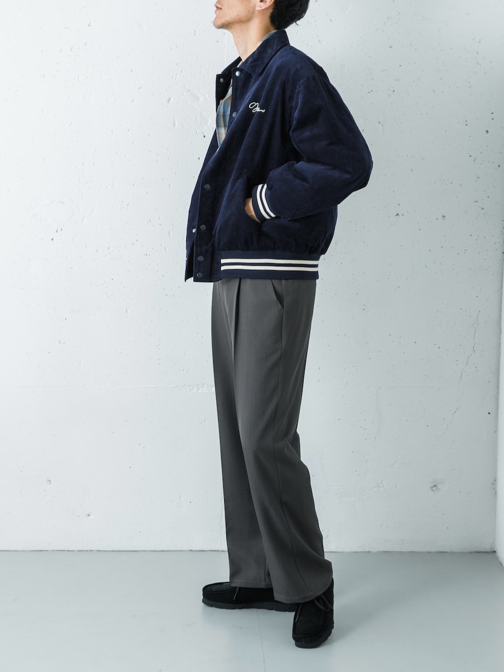 温かみのあるコーデュロイパデッドブルゾンに、トラッドなチェック柄のシャツをインナーとして合わせ、程よく軽快な印象に。