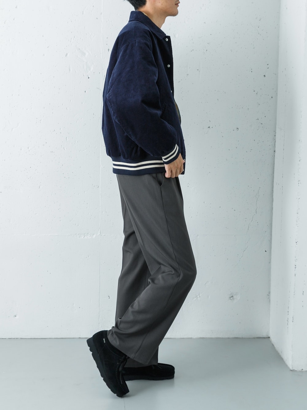 ボトムスは汎用性の高いタックスストレートパンツを選び、全体のバランスを整えました。