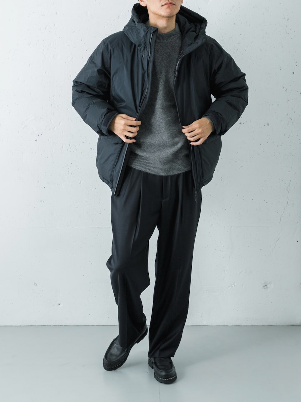 ボトムスには落ち感のあるウールシルク混のパンツを選び、ダウンのカジュアルさを品の良さで引き締めます。