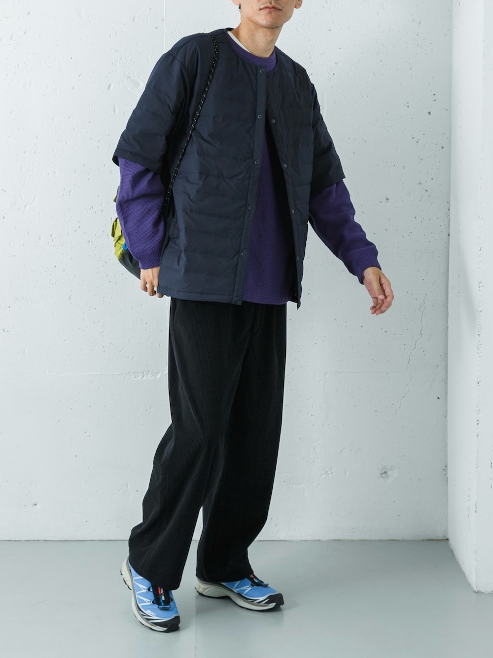 ボトムスにはコーデュロイのワイドパンツを選び、上下のトーンを揃えることでまとまりのある印象に仕上げました。