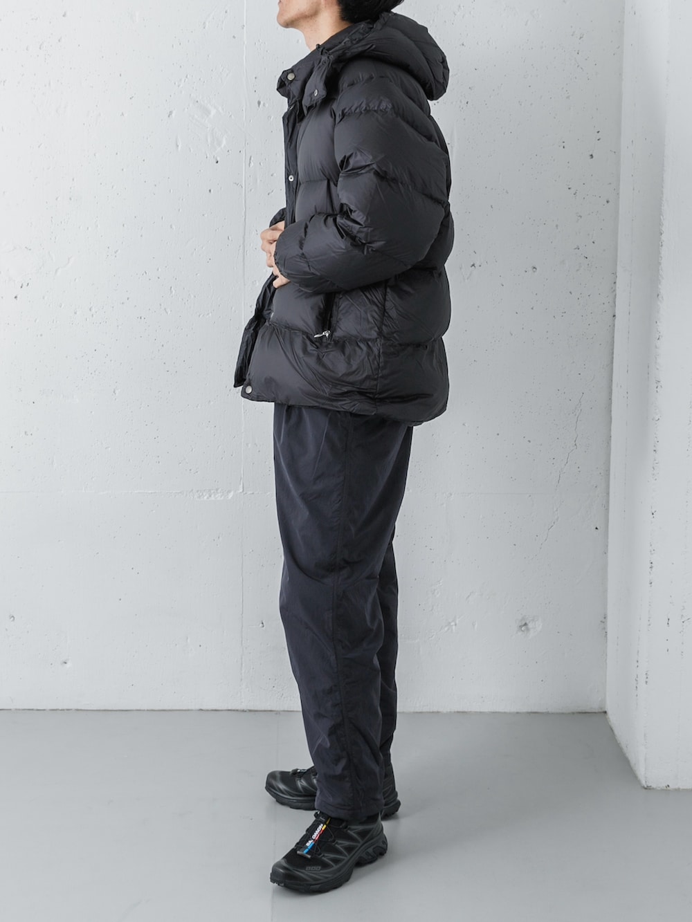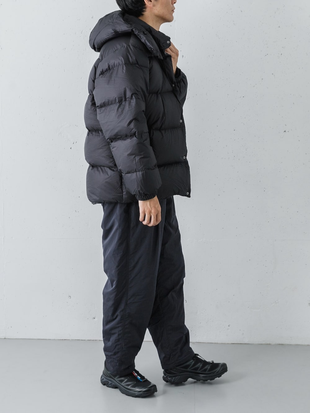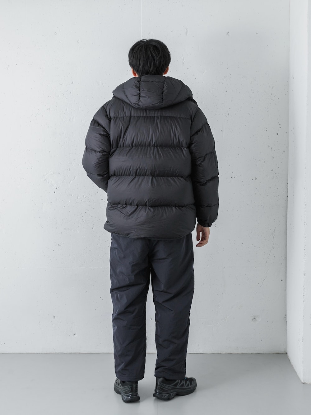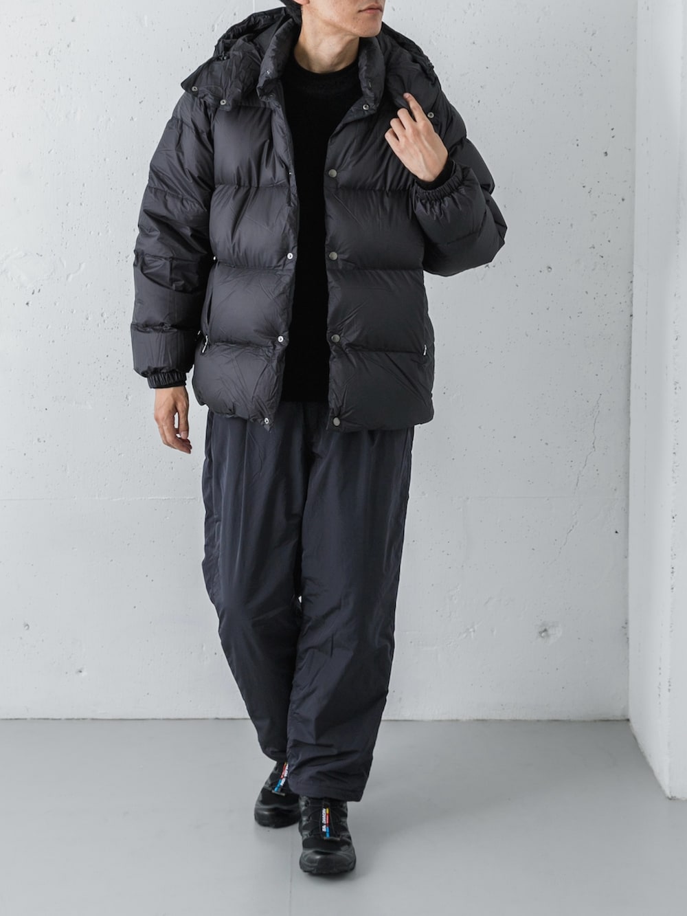 ボトムスには中綿入りのワイドパンツを選び、上下でリラックス感のあるシルエットを構築しました。