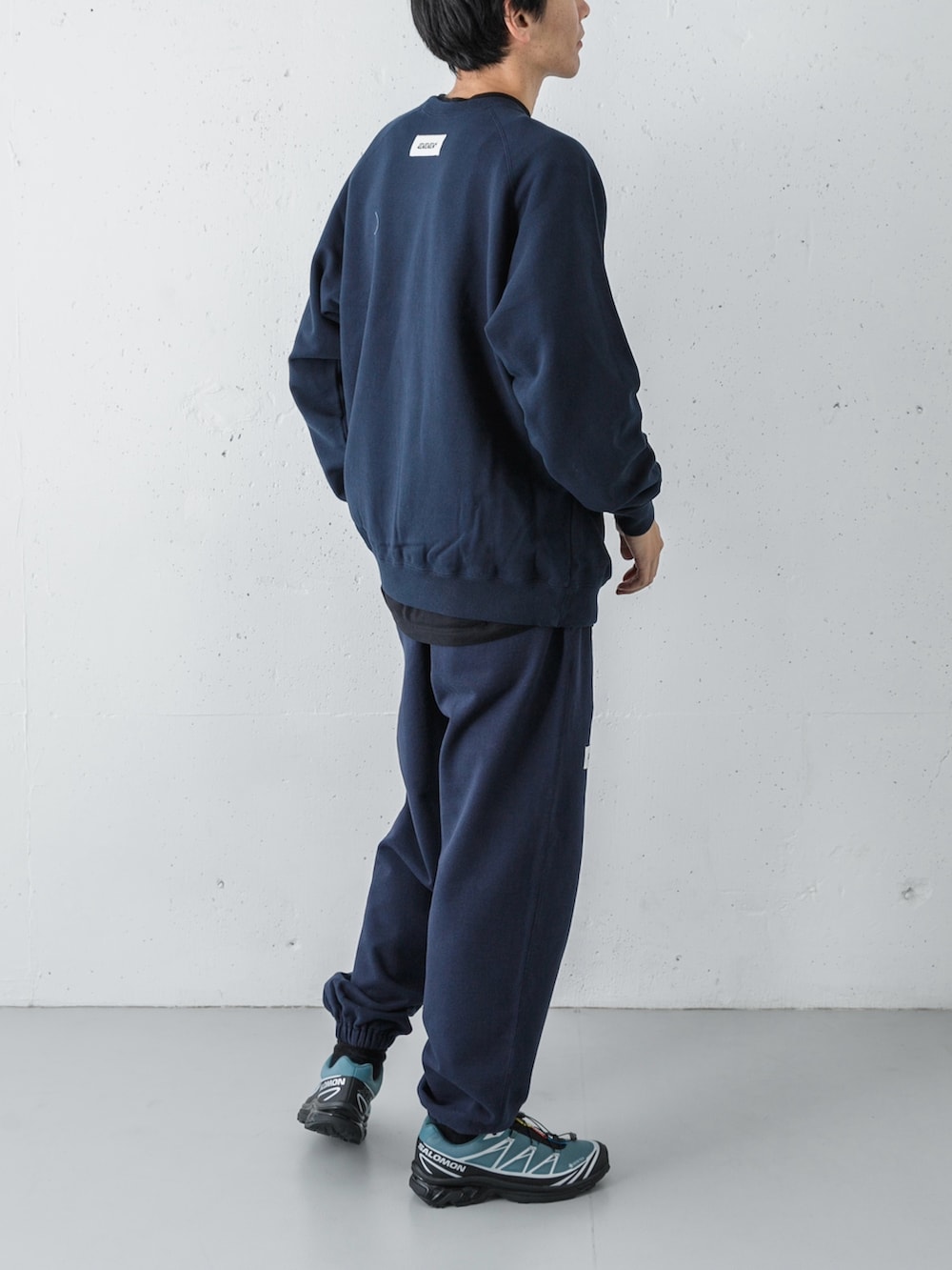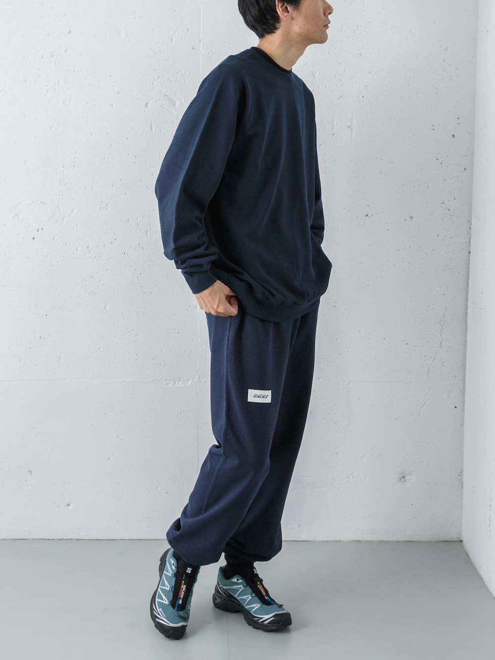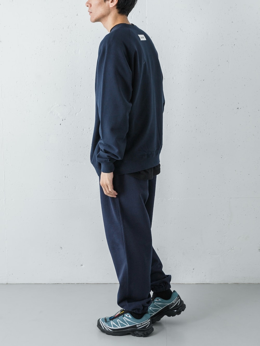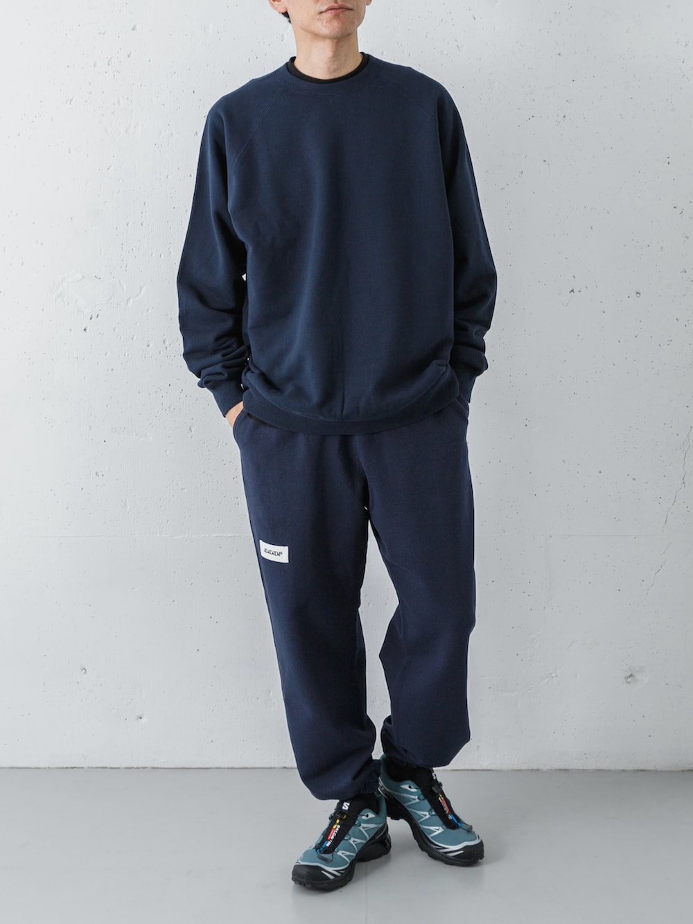 ゆったりとしたラグランスリーブのクルーネックスウェットに、同じくリラックス感のあるスタンダードスウェットパンツを合わせた、快適なセットアップスタイル。