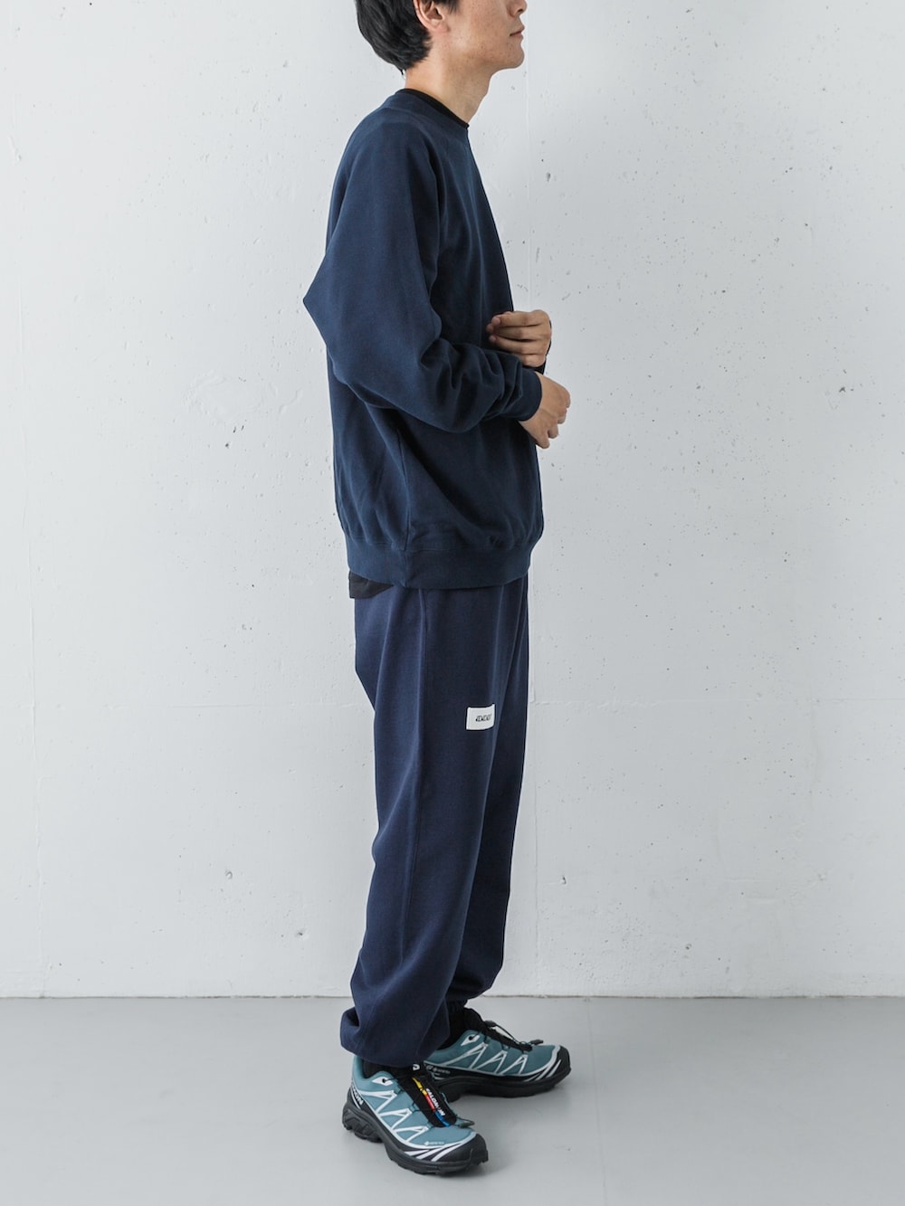 上下をネイビーのワントーンでまとめることで、スウェットながらも洗練された統一感を演出します。