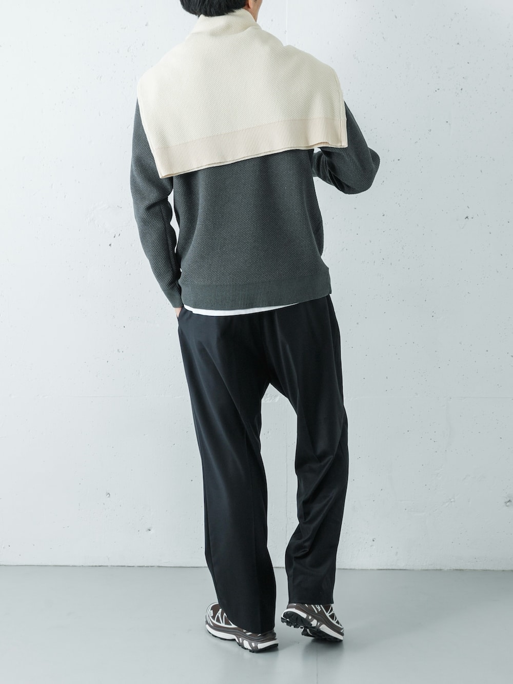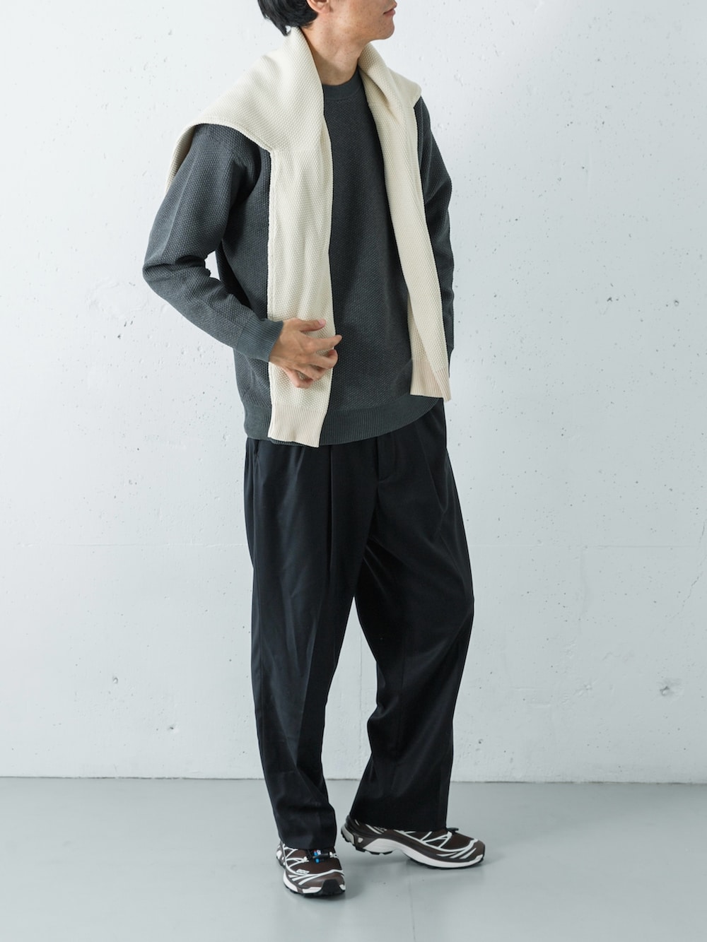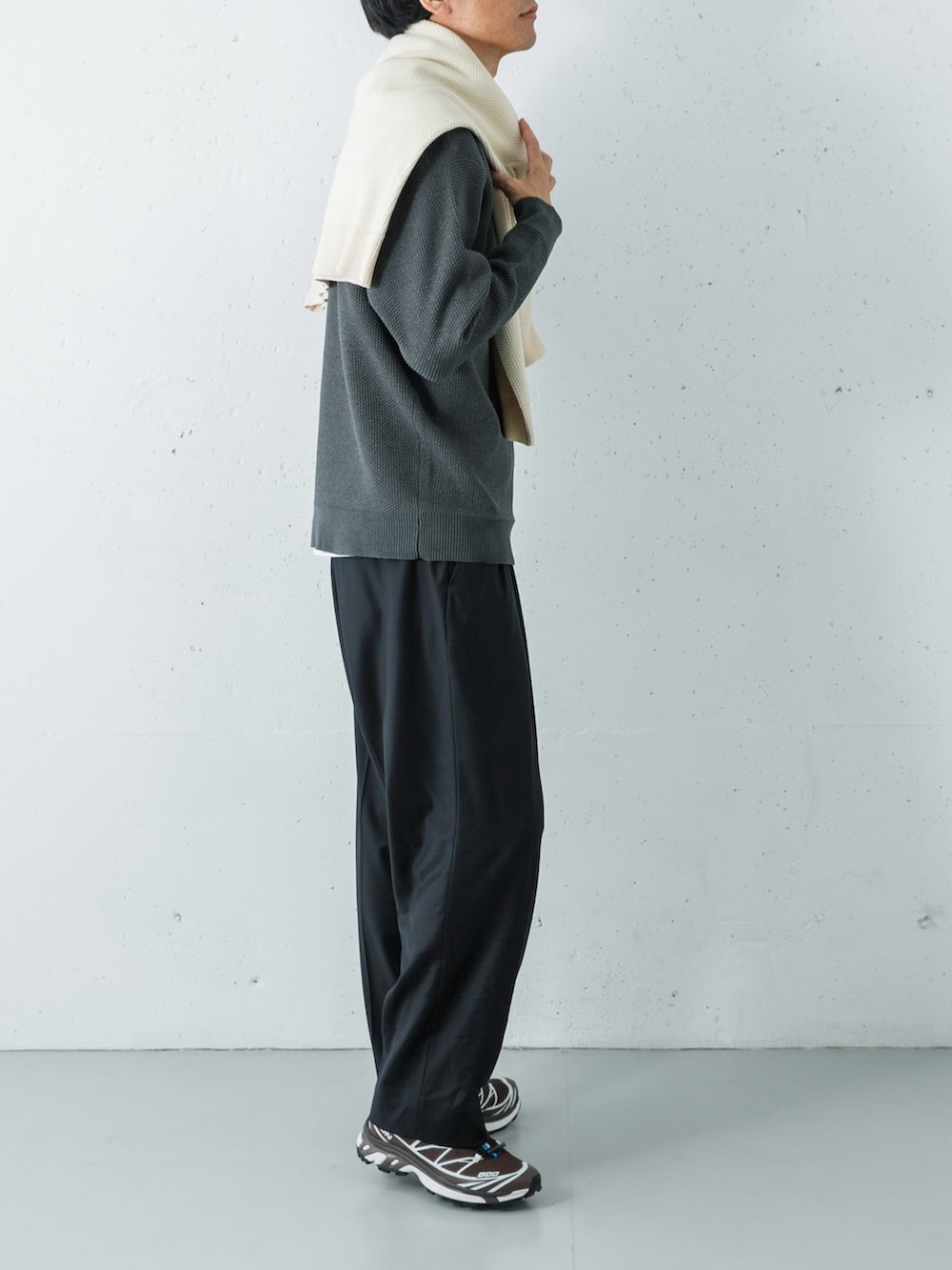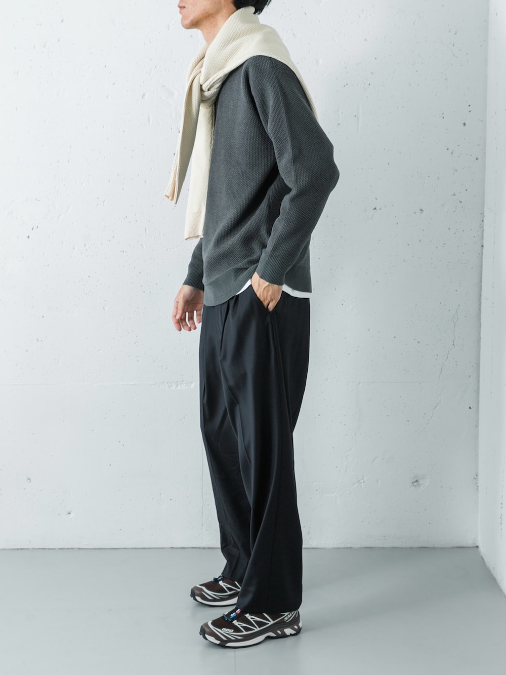 足元にはサロモンのスニーカーを合わせ、都会的な軽快さをプラスした、素材の表情を楽しむ洗練された着こなしです。