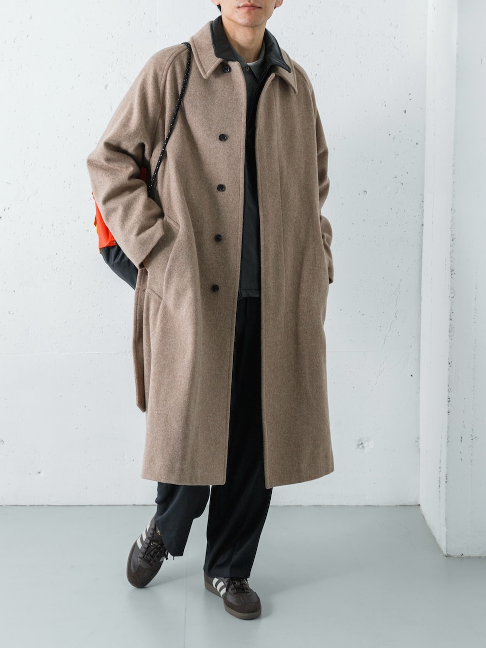 インナーには柔らかなアルバトロスウールシャツを選び、ボトムスには落ち感のあるウールシルク混のパンツを合わせ、全体をシックなトーンでまとめました。