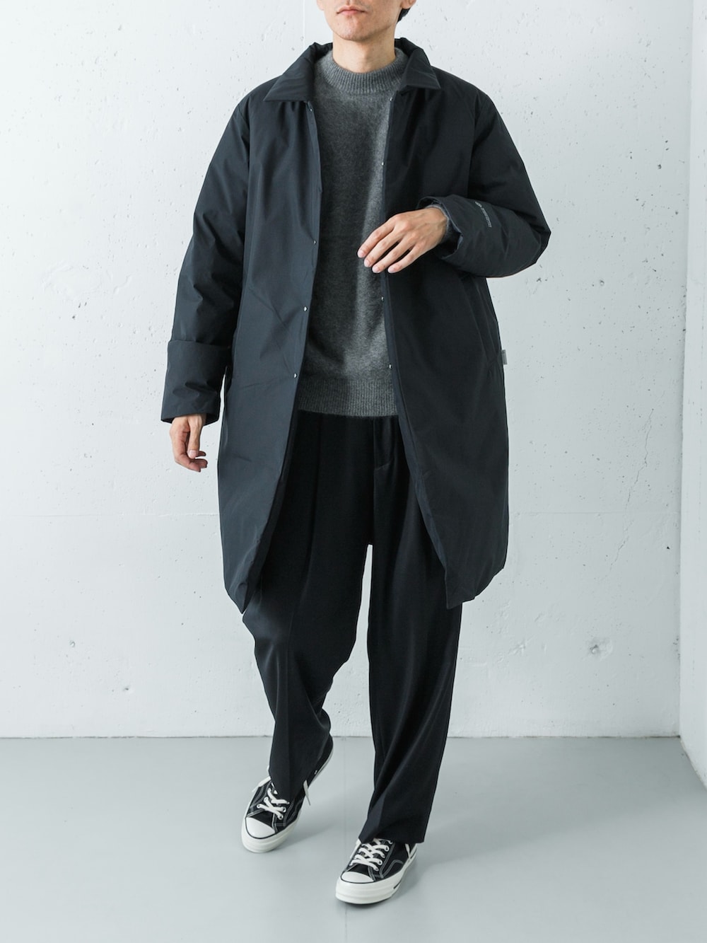 ボトムスには、上品な光沢と美しい落ち感が特徴のウールシルクギャバジンパンツをセレクト。コートのボリュームを、スラックスのドレープ感がエレガントに受け止め、カジュアルなダウンスタイルを一段上の「装い」へと引き上げています。