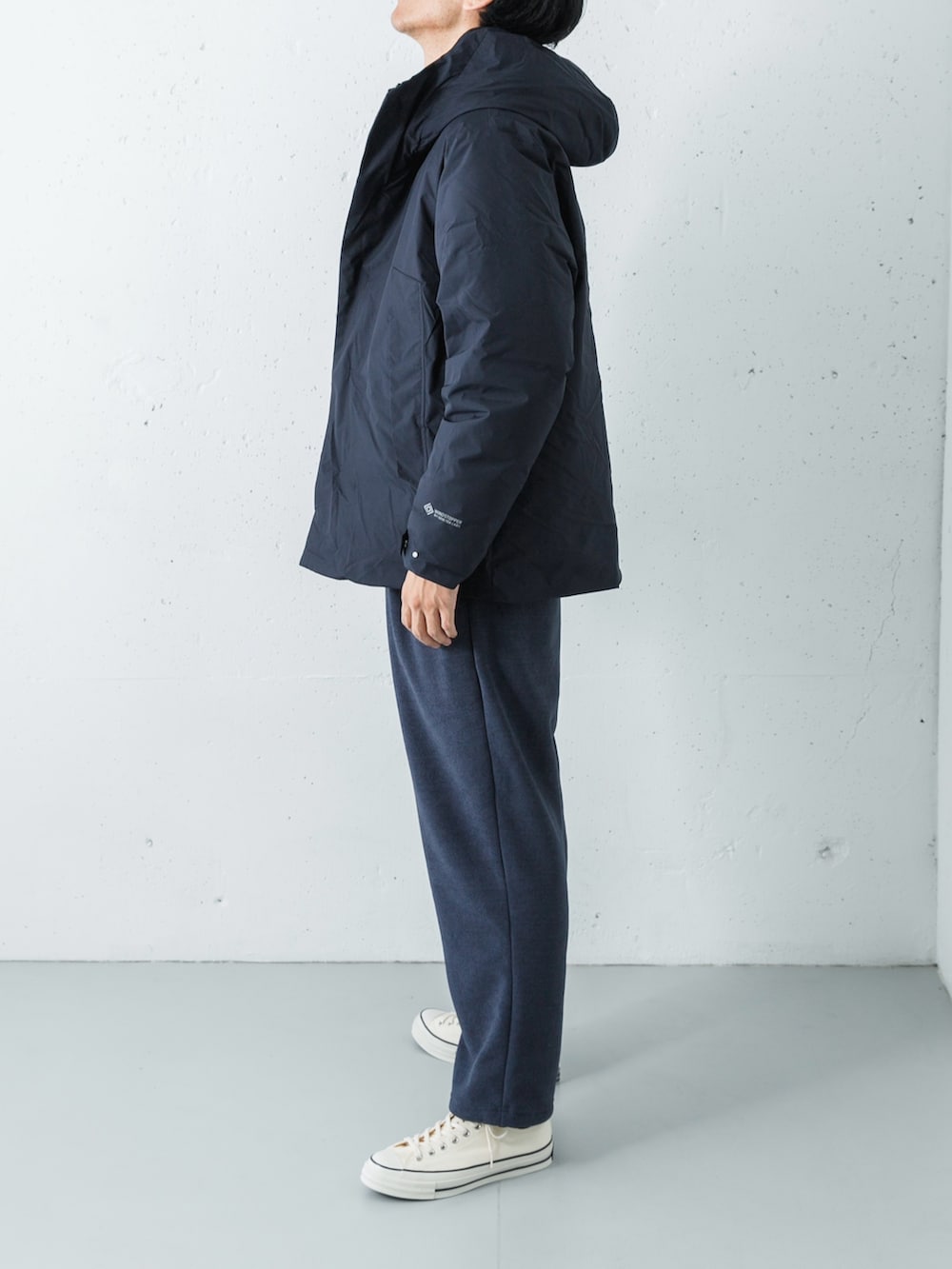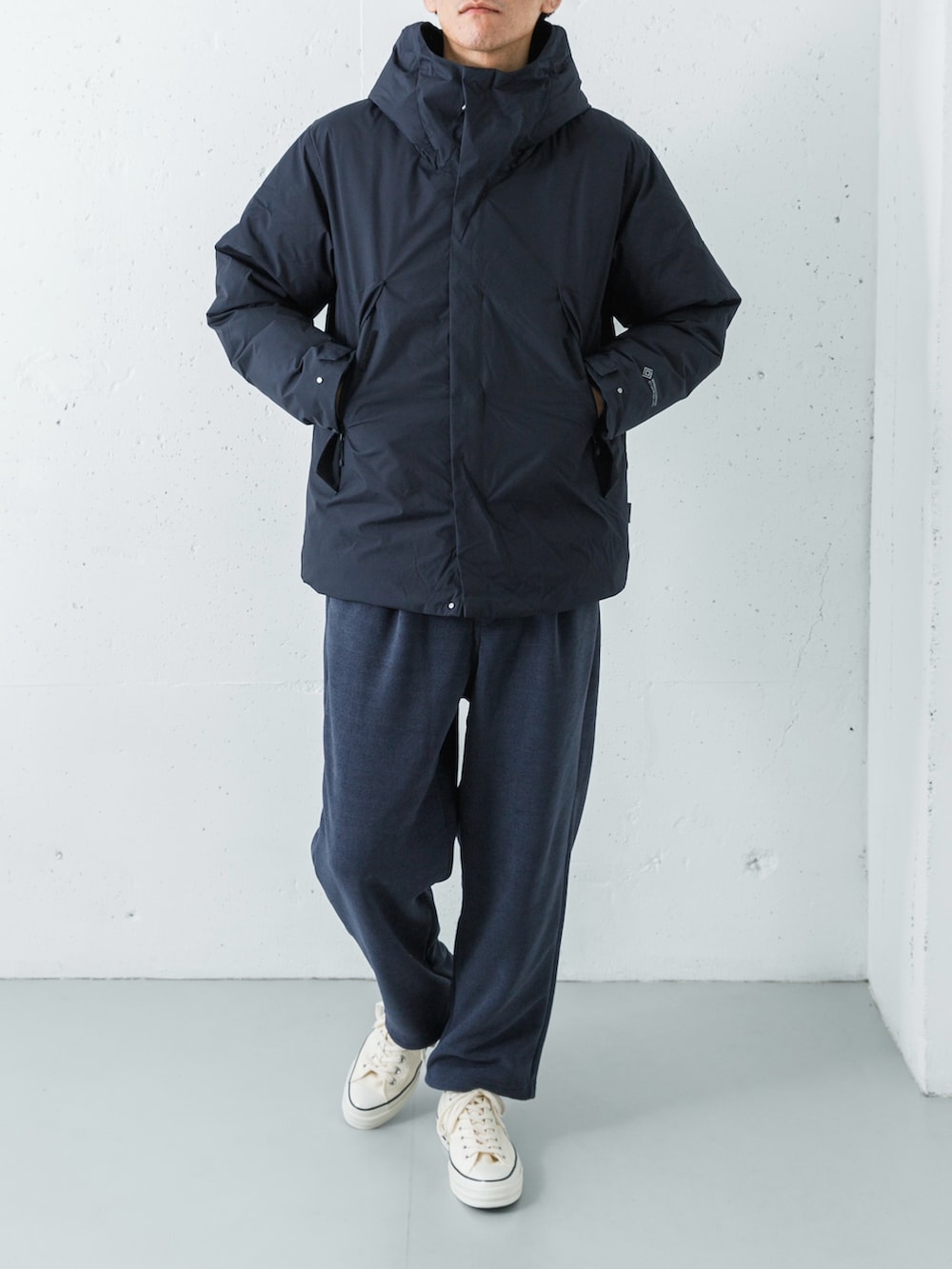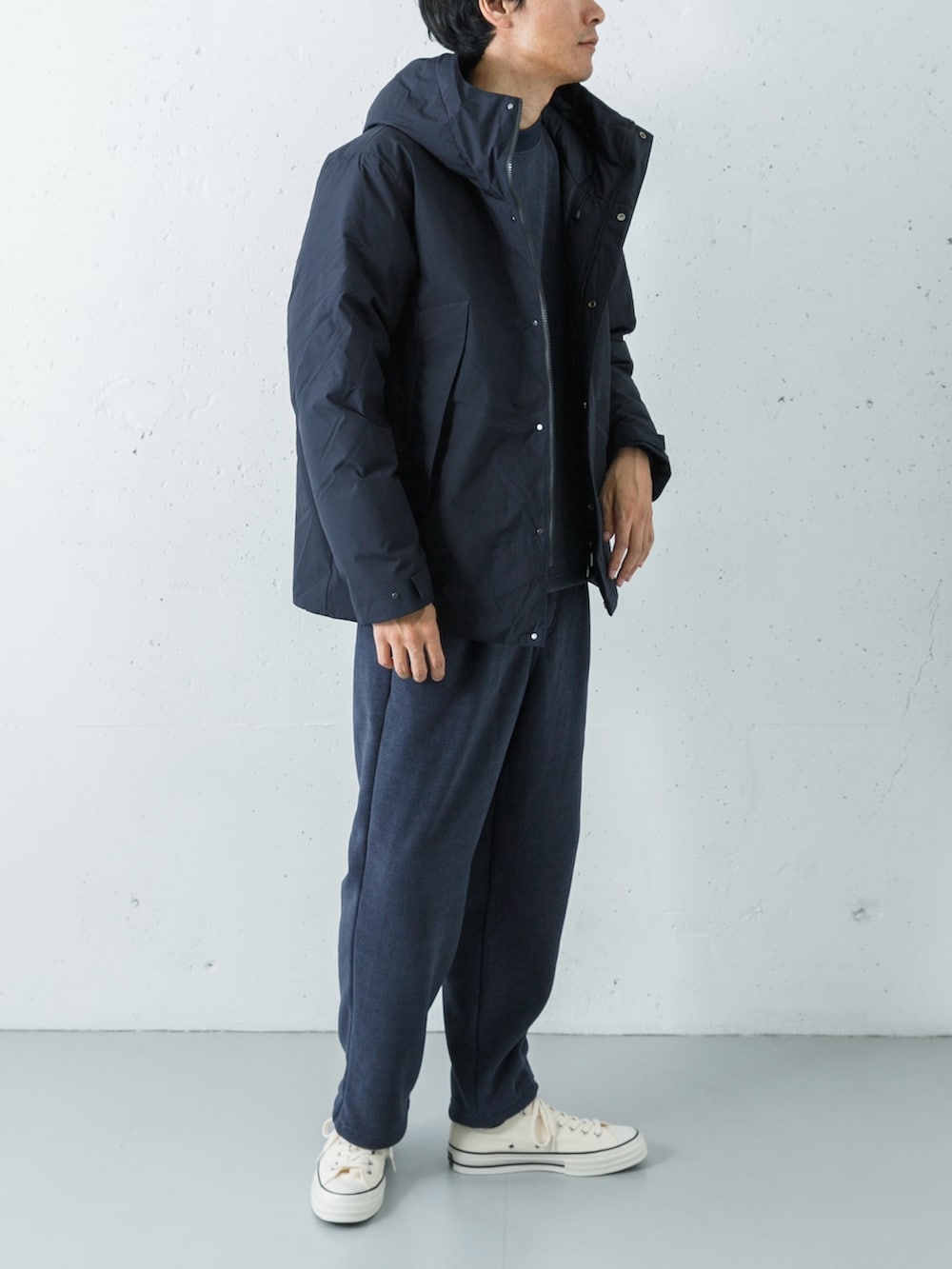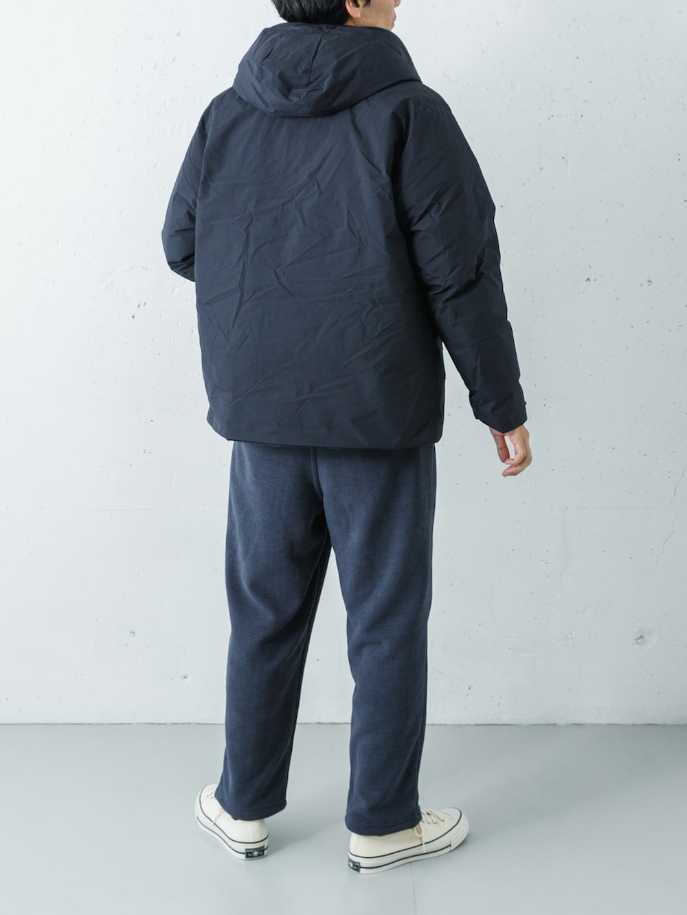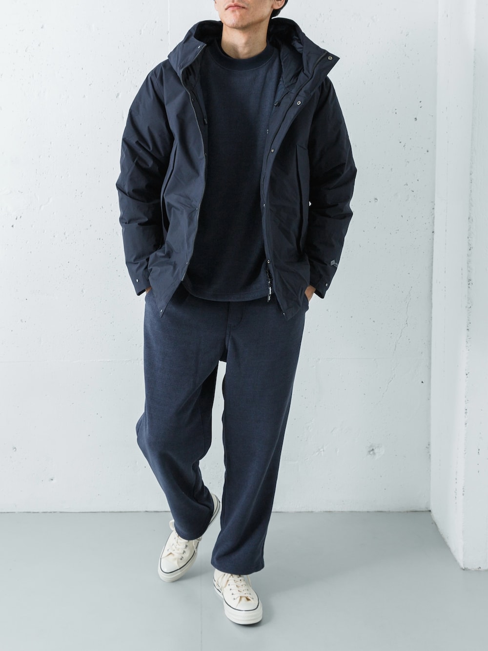 インナーのフリース素材は、ダウンの機能性を最大限に引き出すとともに、ニットのような柔らかな質感をプラス。上下セットアップによるリラックスしたシルエットを、ダウンジャケットのボリューム感がバランス良く引き締めています。
