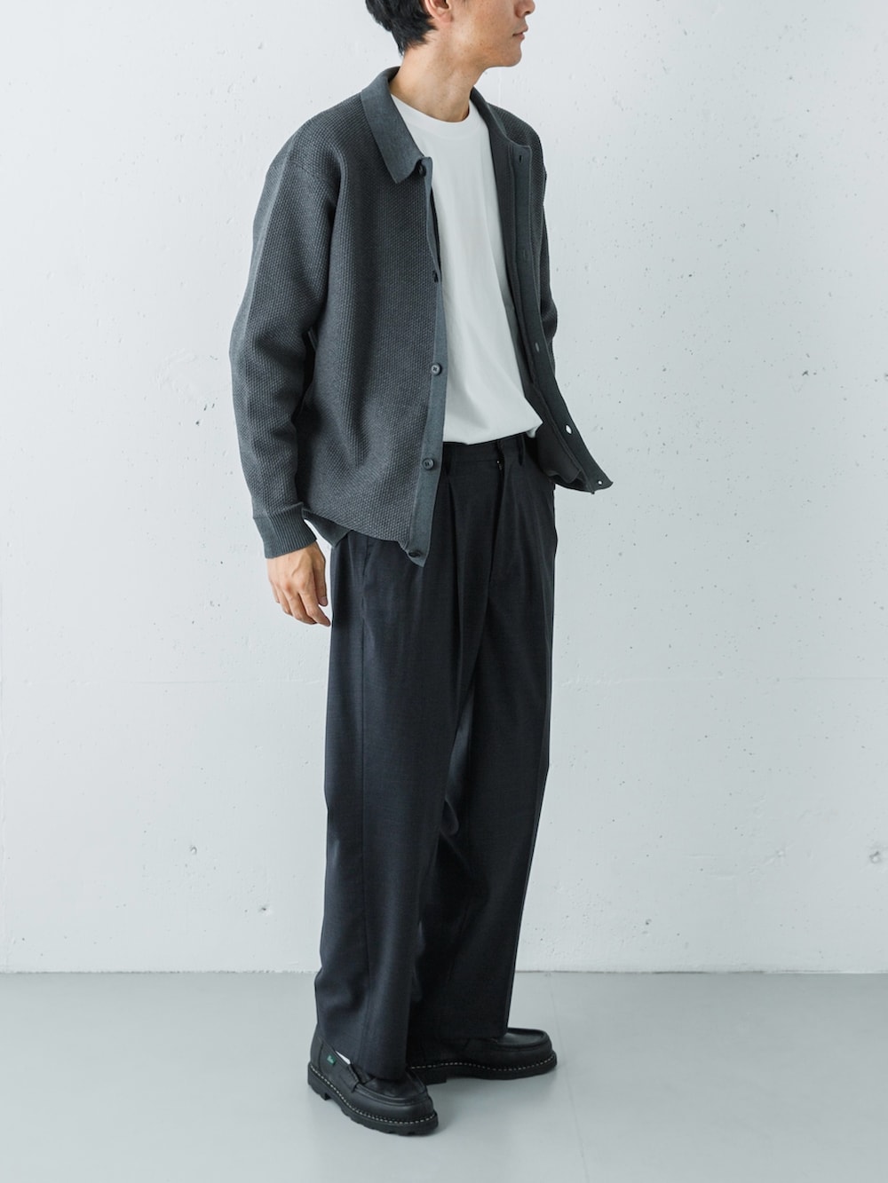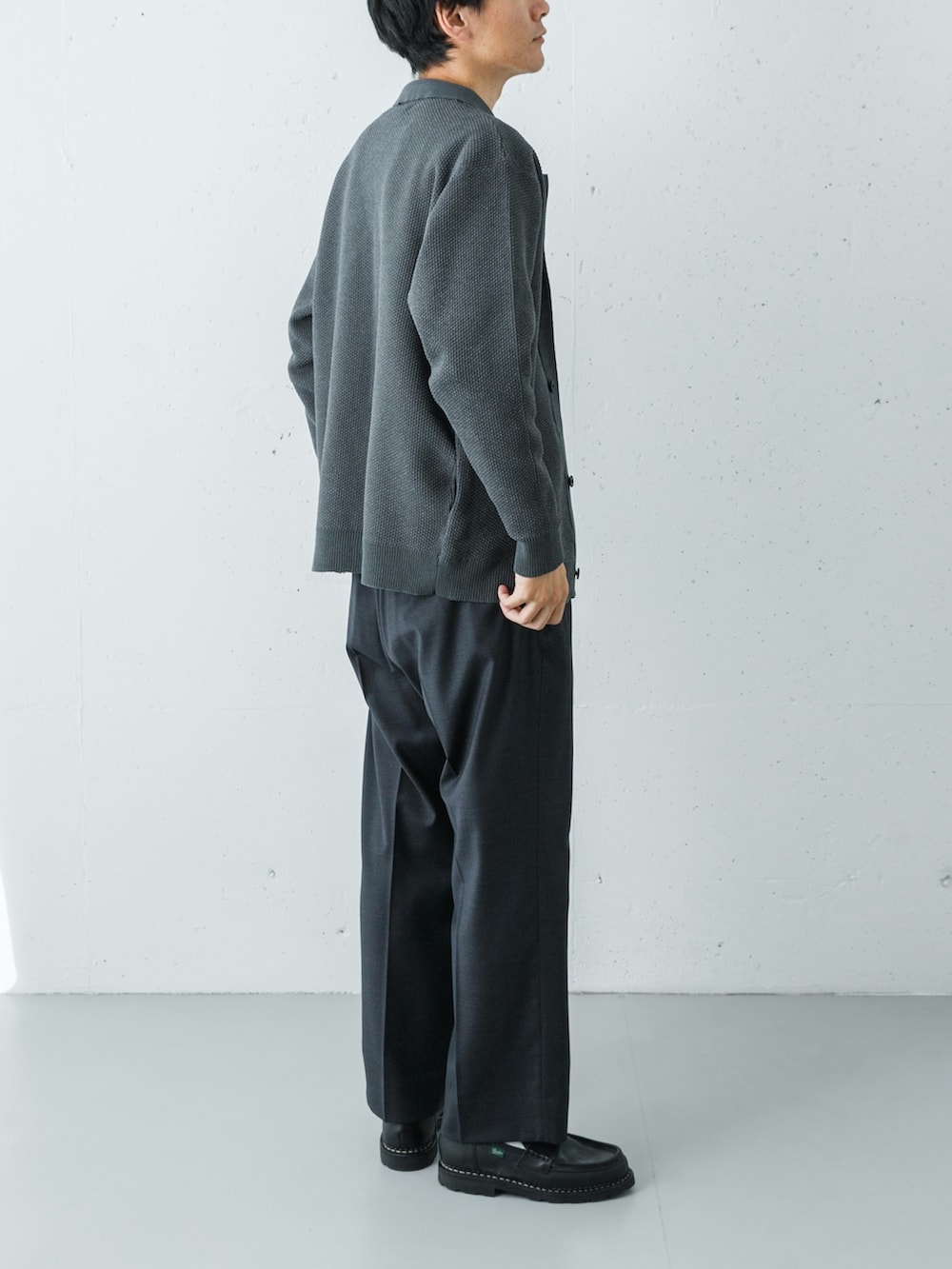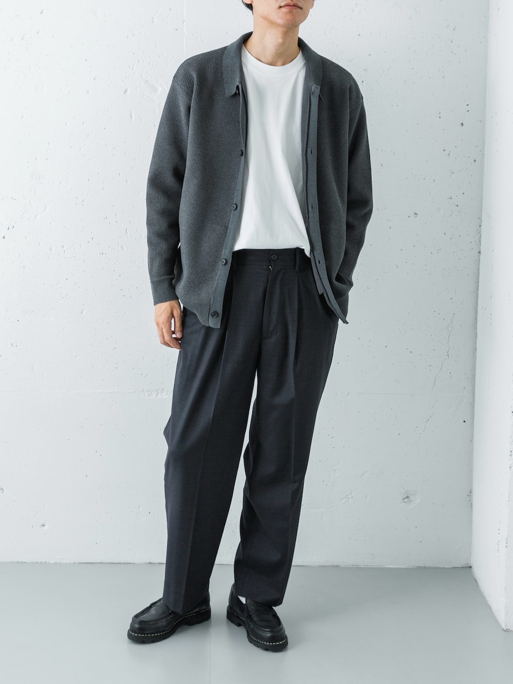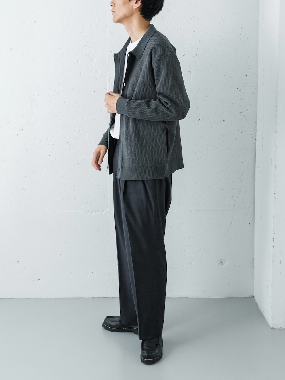 ボトムスには、同じくチャコールカラーのウールシルクギャバジンパンツをセレクト。モールの「マットな起毛感」と、ウールシルクの「滑らかな落ち感」という、同色ながら異なる質感を重ねることで、単調にならない奥行きのあるグラデーションを構築しました。