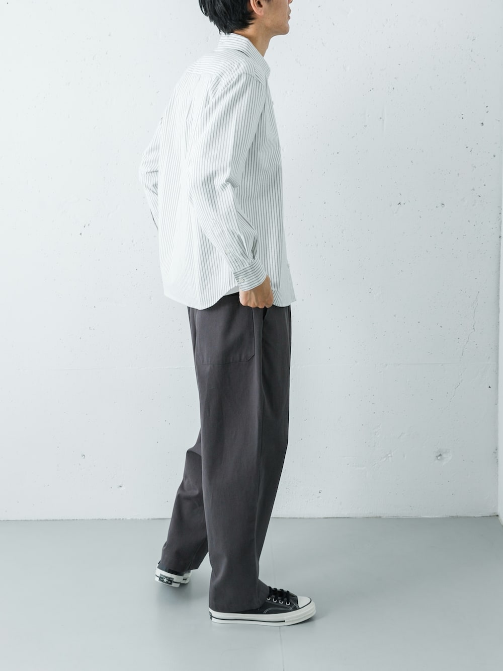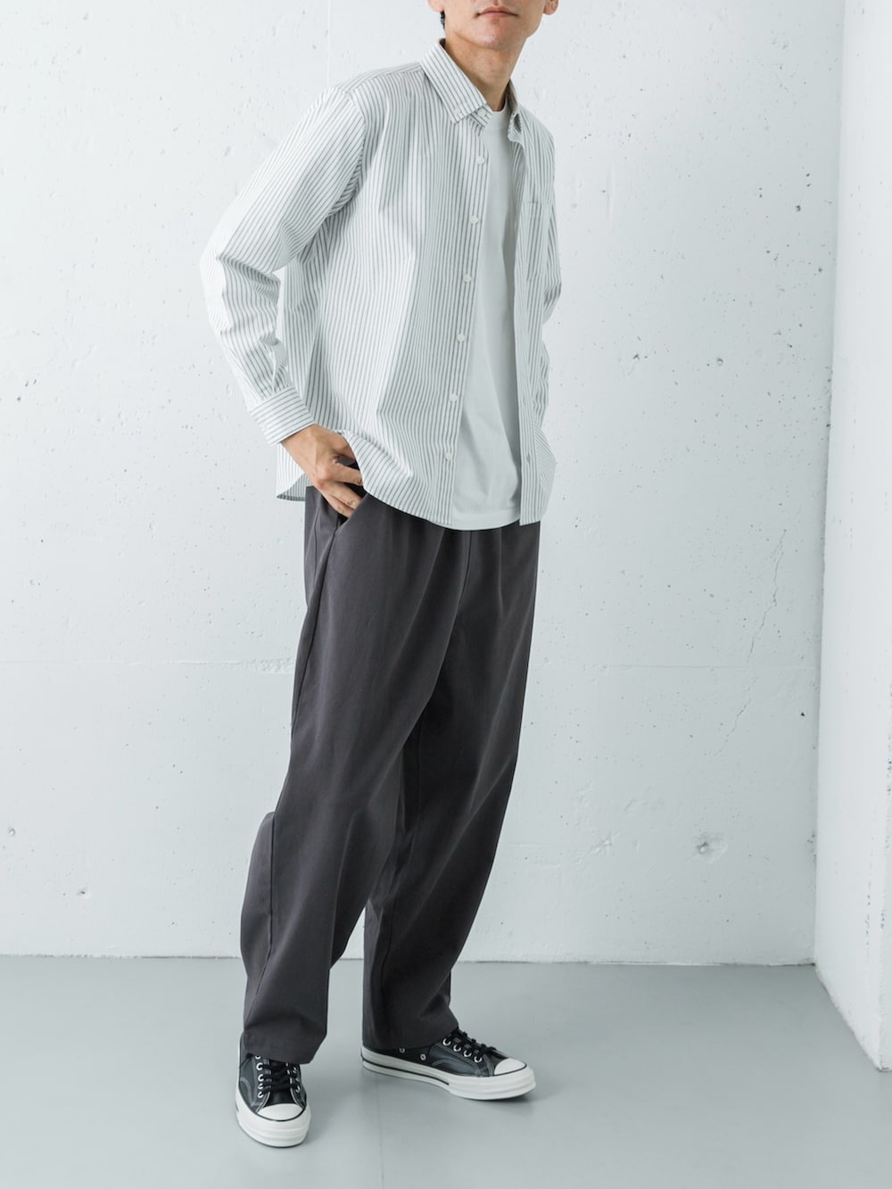 トップスは、クリーンな印象のオフストライプのボタンダウンシャツ。抗菌機能を備えたオックス素材は、デイリーユースに最適なタフさと、洗いざらしでもサマになるこなれ感があります。ストライプの縦ラインが、上半身をスマートに見せてくれます。