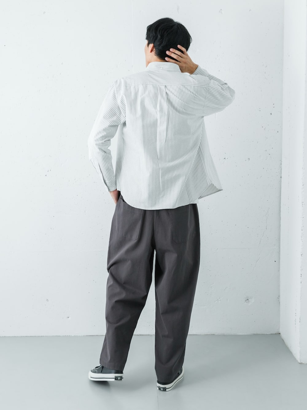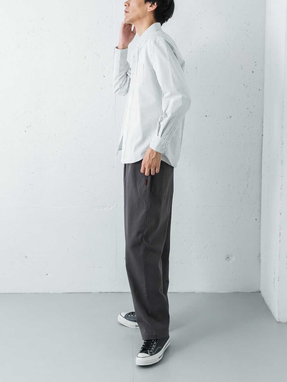 ボトムスには、あえてワイドシルエットのイージーチノパンツをセレクト。カラーをチャコールにすることで、ベージュチノよりも都会的で落ち着いたムードを演出しています。ウエストがイージー仕様のゆったりしたシルエットが、ボタンダウンシャツの「カッチリ感」を程よく崩し、今の空気感にマッチしたリラックス・トラッドを構築しています。