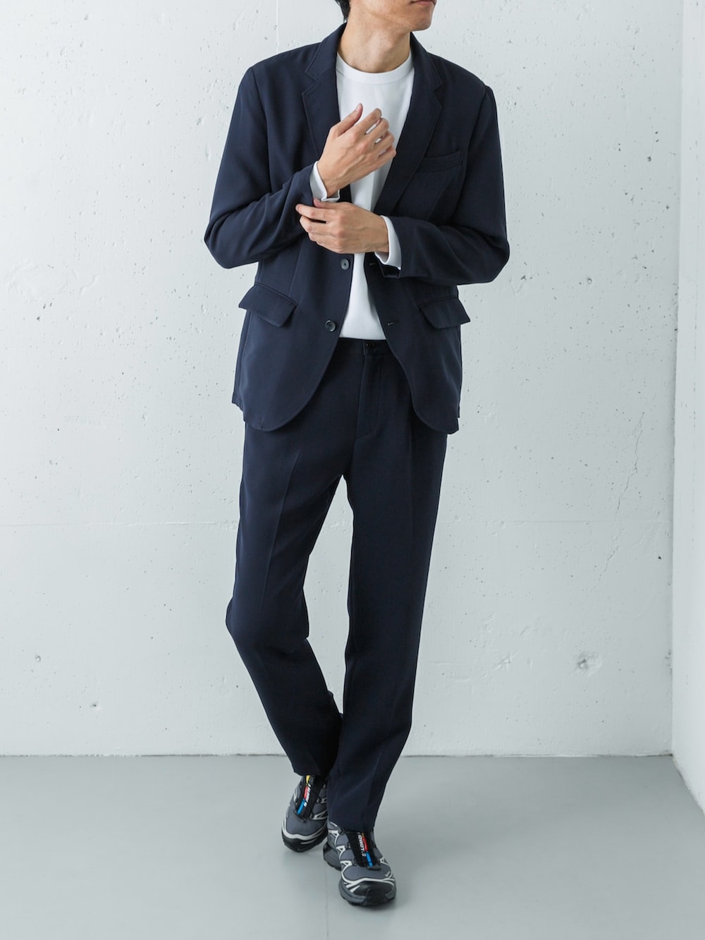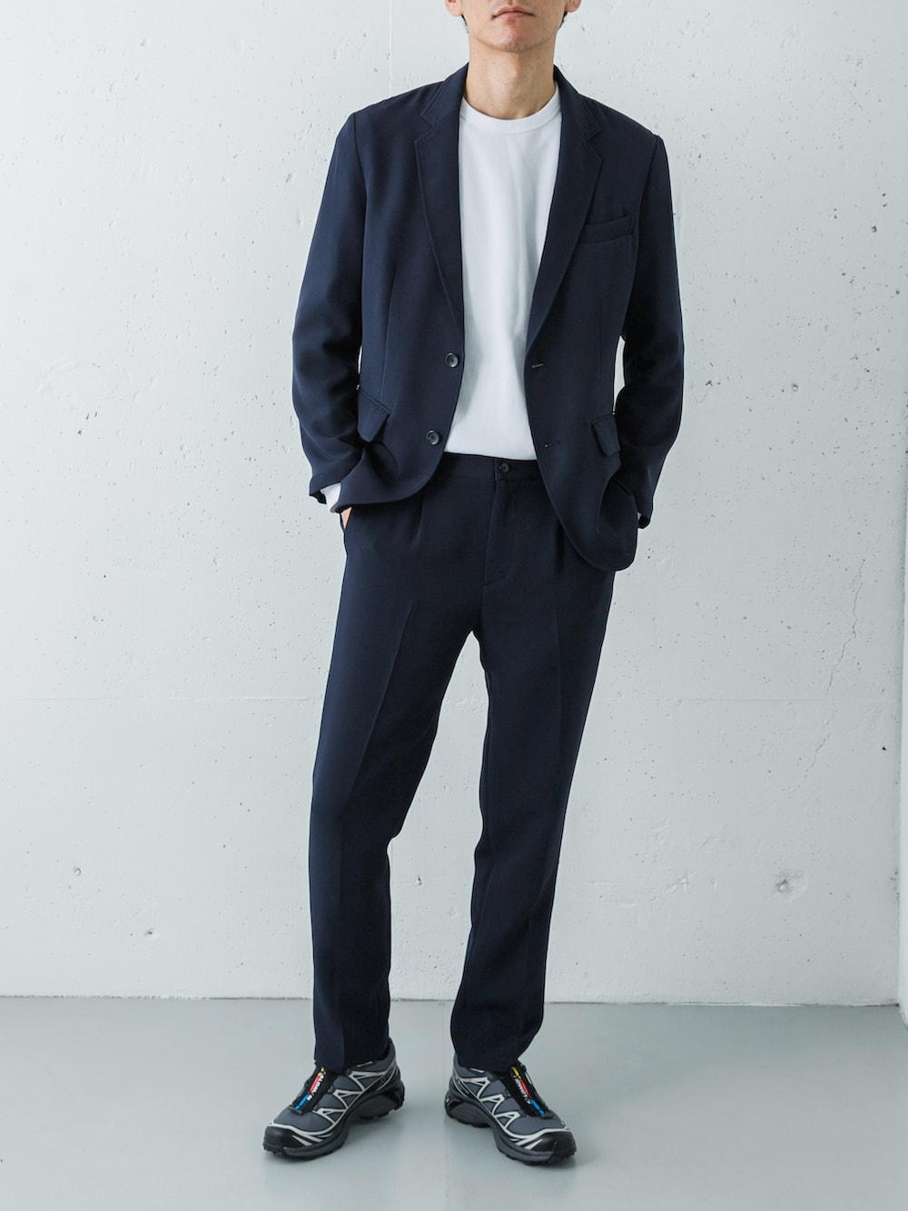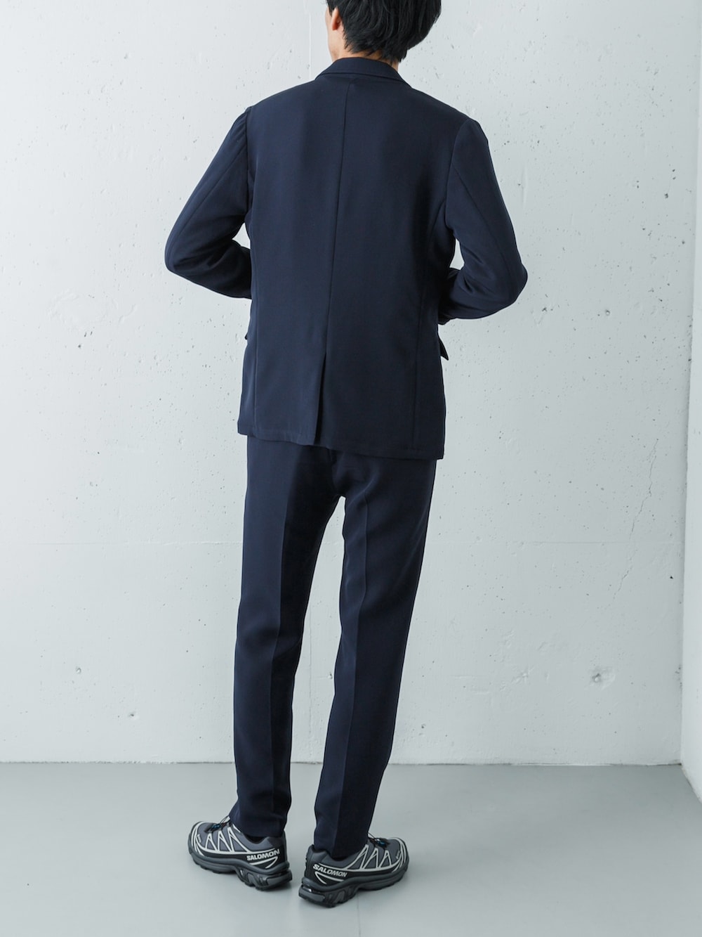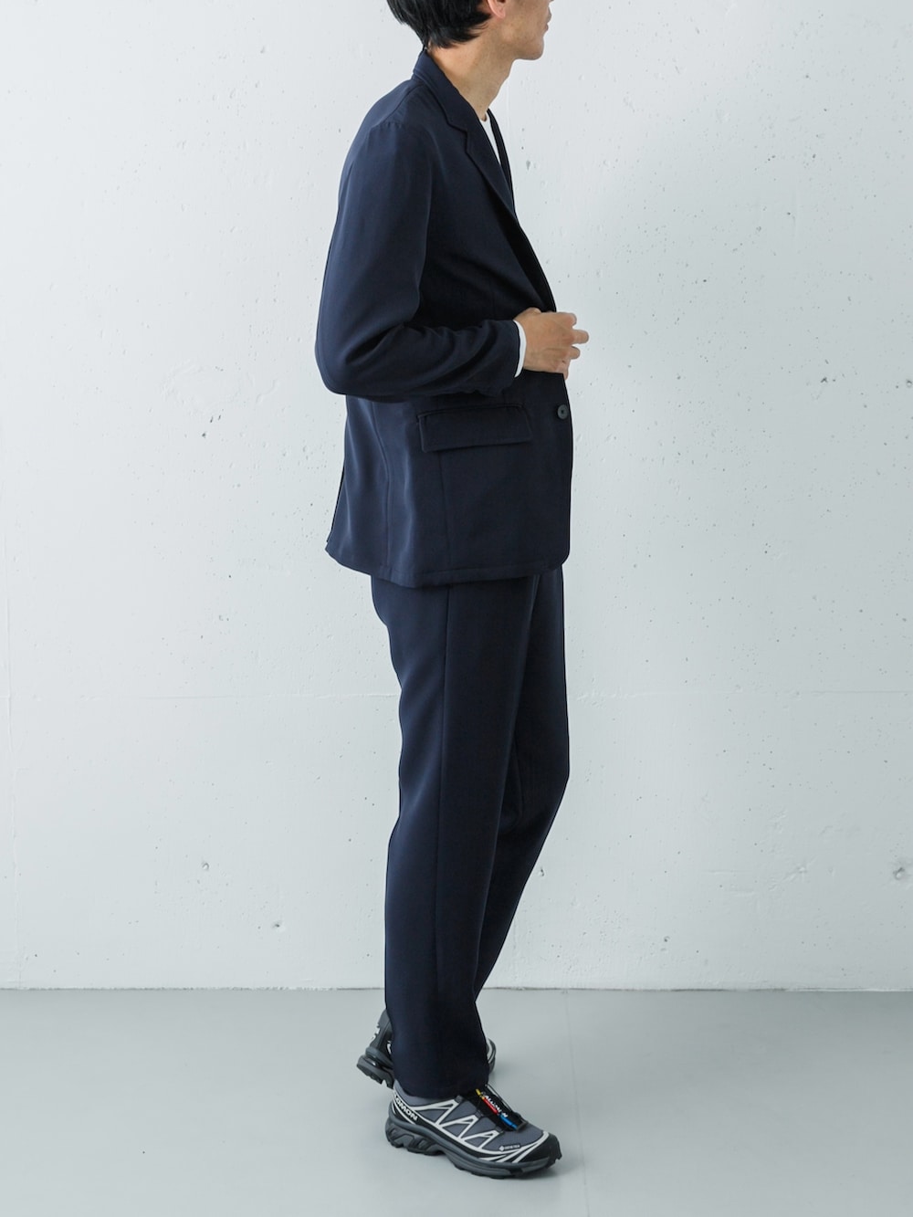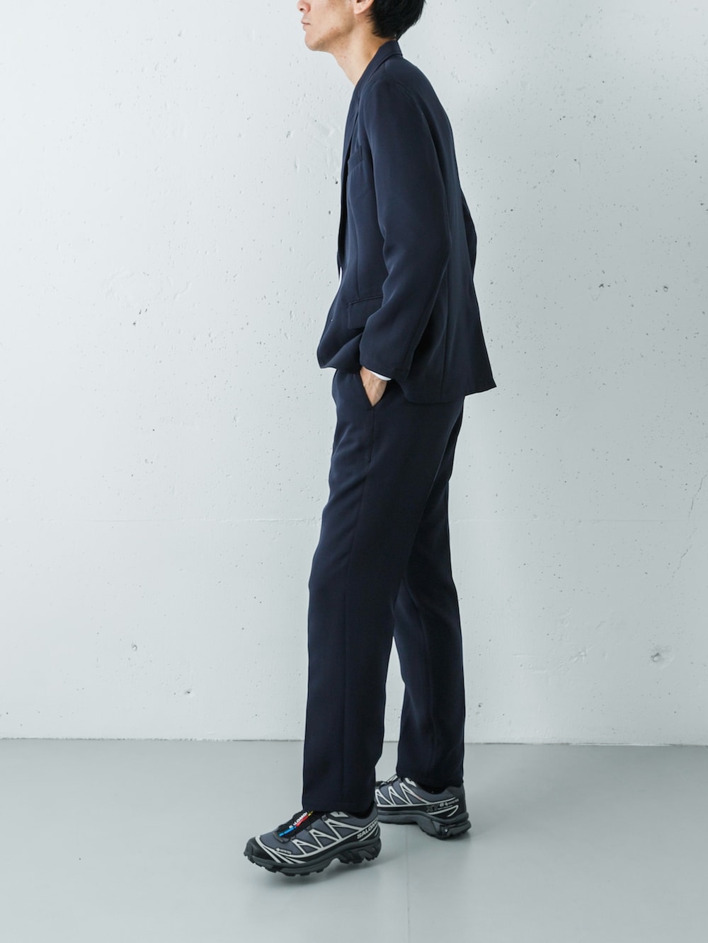 足元は、あえてのSALOMON XT-6 GTX (LUNAR ROCK)。ネイビーのセットアップという王道スタイルに対し、ハイテクなフォルムと淡いグレー(ルナロック)の色彩を合わせることで、一気に「今の空気感」を纏ったアーバン・スタイルへと昇華させています。