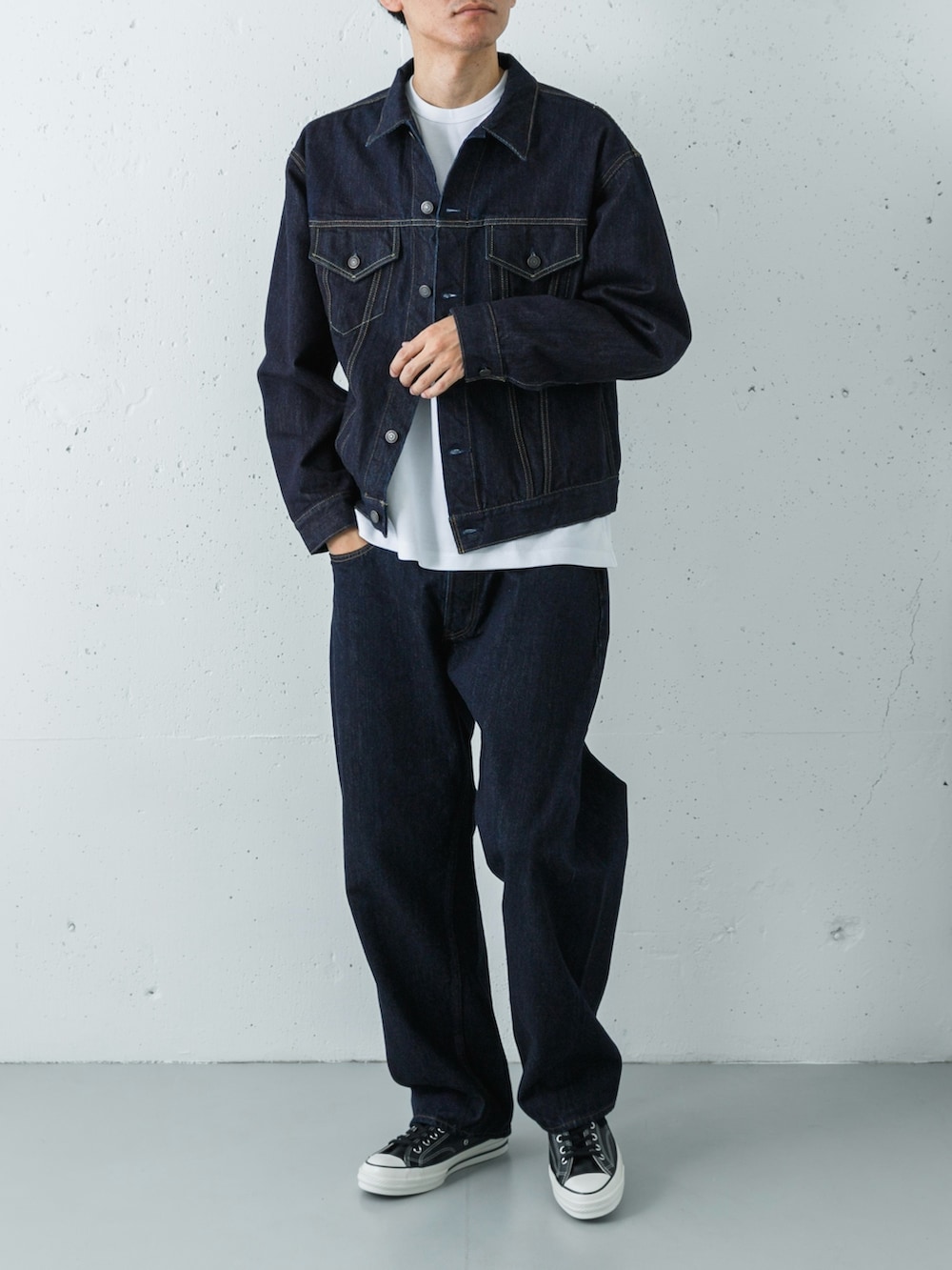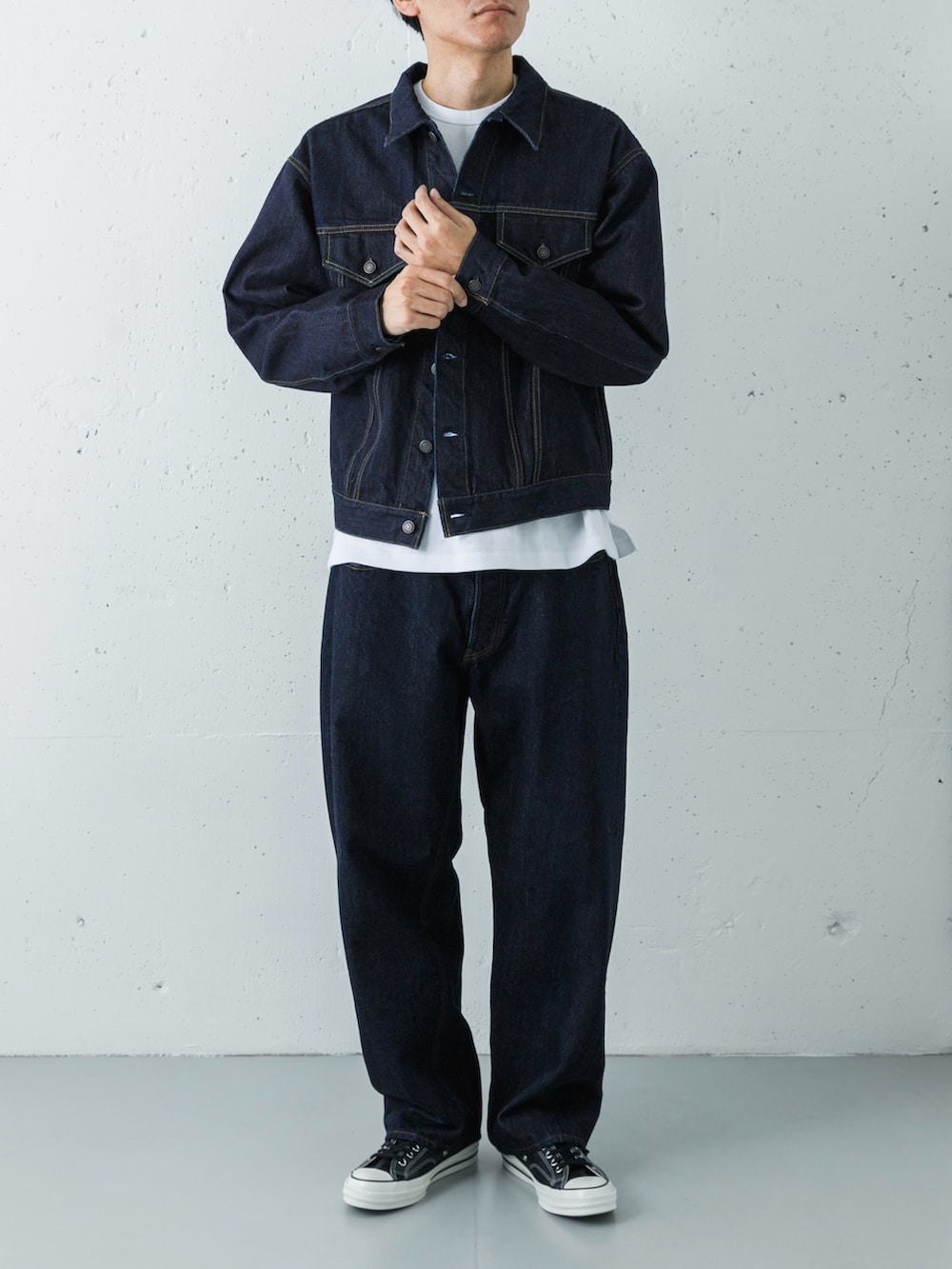 主役は、CIOTA×URBAN RESEARCH別注のトラッカージャケットとバギー5ポケットパンツ。カラーは、深く、吸い込まれるようなDARK NAVY。CIOTAが誇るスビンコットンの油脂分が生み出す特有の光沢により、リジットのような濃紺でありながら、どこか艶やかで色気のある表情を見せています。