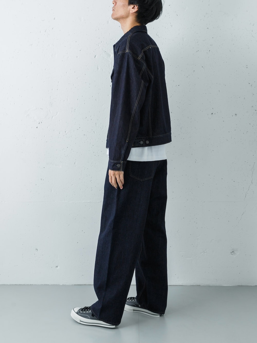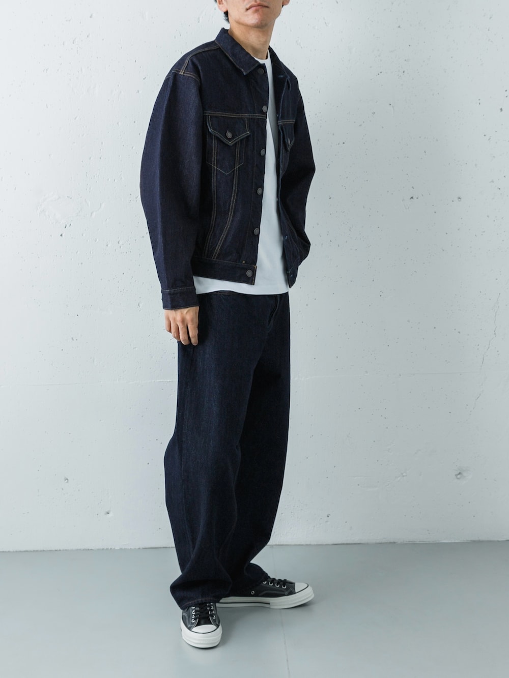 特筆すべきは、バギーシルエットによるボリューム感です。上半身のコンパクトなジャケットに対し、足元にかけてたっぷりと生地を使ったバギーパンツを合わせることで、モードなAラインシルエットを構築。デニムセットアップという無骨なカテゴリーを、素材の良さとシルエットの遊びで「洗練された大人の着こなし」へと昇華させています。